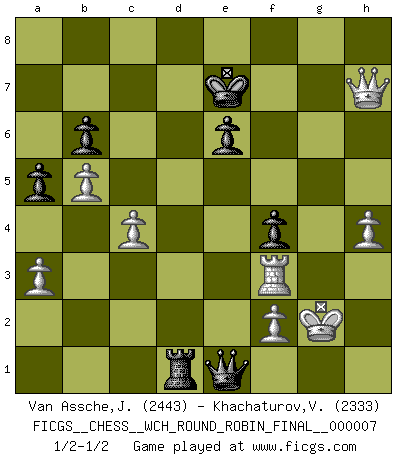 Last move : 1/2-1/2 2011 July 12 19:29:59 [Event "FICGS__CHESS__WCH_ROUND_ROBIN_FINAL__000007"] [Site "FICGS"] [Date "2011.04.01"] [Round "1"] [White "Van Assche,Jeroen"] [Black "Khachaturov,Vadim"] [Result "1/2-1/2"] [WhiteElo "2443"] [BlackElo "2333"] 1.d4 Nf6 2.c4 e6 3.Nc3 Bb4 4.Qc2 O-O 5.a3 Bxc3+ 6.Qxc3 b6 7.Bg5 Bb7 8.e3 d6 9.Ne2 Nbd7 10.Qc2 h6 11.Bh4 c5 12.Rd1 Qe7 13.Nc3 cxd4 14.Rxd4 Ne5 15.Be2 g5 16.Bg3 Bxg2 17.Rg1 Bf3 18.Nb5 Nfd7 19.Nxd6 Qf6 20.Bxe5 Nxe5 21.Rg3 Rad8 22.b4 a5 23.b5 Bxe2 24.Kxe2 Ng6 25.Rf3 Nf4+ 26.Kf1 Qe5 27.Nxf7 Kxf7 28.Rxd8 Rxd8 29.exf4 gxf4 30.Qh7+ Ke8 31.Qxh6 Rd4 32.Qg6+ Ke7 33.h4 Rd1+ 34.Kg2 Qe1 35.Qh7+ 1/2-1/2 Nimzo-Indian : Classical variation Kingside Castling by player Black (move 4) This chess game ended in a draw. Follow this game move after move (download)Pawns are born free, yet they are everywhere in chains. (Rick Kennedy) Habe Mut, dich deines eigenen Verstandes zu bedienen. (Immanuel Kant) ¿Que sería del Ajedrez sin errores graciosos?. (Kurt Richter) A chaque perte on perd un peu de soi. (Joël Lautier) The problem with troubleshooting is that trouble shoots back. (Anonymous)