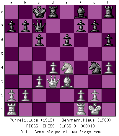 Last move : 0-1 2007 March 15 1:53:2 [Event "FICGS__CHESS__CLASS_B__000010"] [Site "FICGS"] [Date "2006.12.16"] [Round "1"] [White "Purreli,Luca"] [Black "Behrmann,Klaus"] [Result "0-1"] [WhiteElo "1913"] [BlackElo "1900"] 1.e4 c6 2.d4 d5 3.Nc3 dxe4 4.Nxe4 Bf5 5.Ng3 Bg6 6.Nf3 e6 7.h4 h6 8.Ne5 Bh7 9.Bd3 Bxd3 10.Qxd3 Nd7 11.Nxd7 Qxd7 12.Be3 O-O-O 13.c3 Nf6 14.O-O Qc7 15.Ne4 Ng4 0-1 Caro-Kann : Classical variation Queenside Castling by player Black (move 12) Kingside Castling by player White (move 14) Player Black won this chess game. Follow this game move after move (download)One of these modest little moves may be more embarrassing to your opponent than the biggest threat. (Siegbert Tarrasch) Ein Schachgenie ist jemand der verdammt gut Schach spielt. (Jonathan Levitt) Ayuda a tus piezas para que ellas te puedan ayudar. (Paul Morphy) À la honte des hommes, on sait que les lois du jeu sont les seules qui soient partout justes, claires, inviolables et exécutées. Pourquoi l'Indien qui a donné les règles du jeu d'échecs est-il obéi de bon gré dans toute la terre, et que les décrétales des papes, par exemple, sont aujourd'hui un objet d'horreur et de mépris ? C'est que l'inventeur des échecs combina tout avec justesse pour la satisfaction des joueurs, et que les papes, dans leurs décrétales, n'eurent en vue que leur seul avantage. L'Indien voulut exercer également l'esprit des hommes et leur donner du plaisir; les papes ont voulu abrutir l'esprit des hommes. Voltaire (Dictionnaire philosophique / Garnier 1967) There is far too much law for those who can afford it and far too little for those who cannot. (Derek Bok)