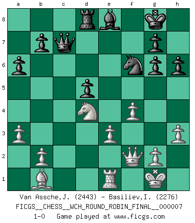 Last move : 1-0 2011 September 23 10:49:25 [Event "FICGS__CHESS__WCH_ROUND_ROBIN_FINAL__000007"] [Site "FICGS"] [Date "2011.04.01"] [Round "1"] [White "Van Assche,Jeroen"] [Black "Basiliev,Iouri"] [Result "1-0"] [WhiteElo "2443"] [BlackElo "2276"] 1.d4 d5 2.c4 c6 3.Nc3 Nf6 4.Nf3 e6 5.Bg5 Nbd7 6.e3 Qa5 7.cxd5 exd5 8.Nd2 Bd6 9.Bd3 h6 10.Bh4 O-O 11.O-O Qc7 12.f4 Re8 13.Re1 a6 14.Rc1 Qb6 15.Qc2 Ng4 16.Nf1 Be7 17.Bxe7 Rxe7 18.h3 Ngf6 19.Qf2 Nf8 20.Nh2 Bd7 21.Nf3 Rd8 22.a3 c5 23.dxc5 Qxc5 24.Bb1 Bc6 25.Ne5 Be8 26.Ne2 Qb6 27.Nd4 Rc7 28.Rxc7 Qxc7 29.Nf5 Ng6 30.Nxg6 fxg6 31.Nd4 1-0 This chess game has been lost on time (started : 2011.04.01 23:14:8) QGD Slav defense Kingside Castling by player Black (move 10) Kingside Castling by player White (move 11) Player White won this chess game. Follow this game move after move (download)The laws of Chess do not permit a free choice: you have to move whether you like it or not. (Emanuel Lasker) Jede Eröffnung ist gut genug um gespielt zu werden, wenn nur ihr Ruf schlecht genug ist. (Savielly Grigorievitsch Tartakower) Yo he agregado estos principios a la ley: pongan los Caballos en acción antes de que los dos Alfiles sean desarrollados. (Emanuel Lasker) Les Echecs ne sont pas pour les âmes timides. Ils requièrent un homme entier, qui ne s'arrête pas aveuglément à ce qui a été déjà établi, mais qui tente individuellement de sonder les profondeurs du jeu. (W. Steinitz) I couldn't make any sense out of what this particular thread is about. It sounds like R2 D2 computer speaking. A space fight ?!? Some 'command' problems in Moscow ? Some killers & narcotic addicts attacking some game & a god wannabe ?? (Dinesh De Silva, lost in a russian conflict in FICGS forum)