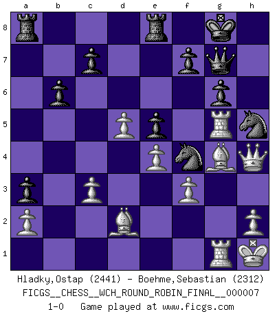 Last move : 1-0 2011 September 16 16:43:5 [Event "FICGS__CHESS__WCH_ROUND_ROBIN_FINAL__000007"] [Site "FICGS"] [Date "2011.04.01"] [Round "1"] [White "Hladky,Ostap"] [Black "Boehme,Sebastian"] [Result "1-0"] [WhiteElo "2441"] [BlackElo "2312"] 1.Nf3 Nf6 2.c4 e6 3.d4 b6 4.Nc3 Bb7 5.e3 Bb4 6.Bd3 O-O 7.O-O Bxc3 8.bxc3 d6 9.Nd2 e5 10.f3 Nc6 11.Qe2 Re8 12.Bb2 a5 13.Qf2 Ne7 14.e4 Nd7 15.Rfe1 Ng6 16.Nf1 Nf4 17.Bc2 h5 18.Ne3 h4 19.Rad1 Qg5 20.Kh1 a4 21.Bc1 Nf8 22.Nd5 N8e6 23.Rg1 Qh5 24.Be3 a3 25.Qd2 Ba6 26.Bb3 Ng6 27.Rb1 Red8 28.Qf2 Bb7 29.g3 Bc6 30.Rbf1 hxg3 31.Rxg3 Bxd5 32.cxd5 Nef4 33.Bc4 Qh4 34.Qd2 Nh3 35.Rg4 Qf6 36.Qe1 Nhf4 37.Rfg1 Nh5 38.Be2 Ngf4 39.Rg5 g6 40.Bf1 Ng7 41.Qg3 Kf8 42.Bd2 Re8 43.Bb5 Ngh5 44.Qh4 Qg7 45.Bd7 Kg8 46.dxe5 dxe5 47.Bg4 1-0 Reti Opening Kingside Castling by player Black (move 6) Kingside Castling by player White (move 7) Player White won this chess game. Follow this game move after move (download)My opponents make good moves too. Sometimes I don't take these things into consideration. (Bobby Fischer) Mit sehr nachdenklichem Gesicht schreitet Bobby durch den Turniersaal. Was ist passiert?, fragt Lombardy. Ich stehe schlecht, antwortet Fischer. Lombardy: Dann biete doch einfach Remis an. Fischer: So schlecht stehe ich nun auch wieder nicht! (Robert James Fischer) Con el tiempo, empecé a progresar en partidas decisivas. Tal vez porque me di cuenta de una simple verdad: no solo estaba yo nervioso sino también mi oponente. (Mikhail Tal) Avec des compensations pour le matériel en plus... (Anonyme) To be champion requires more than simply being a strong player; one has to be a strong human being as well. (Anatoly Karpov)