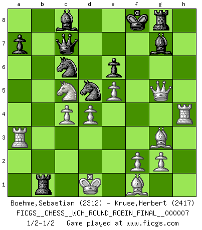 Last move : 1/2-1/2 2011 June 22 14:50:9 [Event "FICGS__CHESS__WCH_ROUND_ROBIN_FINAL__000007"] [Site "FICGS"] [Date "2011.04.01"] [Round "1"] [White "Boehme,Sebastian"] [Black "Kruse,Herbert"] [Result "1/2-1/2"] [WhiteElo "2312"] [BlackElo "2417"] 1.d4 Nf6 2.c4 e6 3.Nf3 d5 4.Nc3 c6 5.Bg5 h6 6.Bh4 dxc4 7.e4 g5 8.Bg3 b5 9.Ne5 Bb7 10.h4 Rg8 11.hxg5 hxg5 12.Nxf7 Kxf7 13.e5 Nd5 14.Rh7+ Bg7 15.Ne4 Qa5+ 16.Ke2 Ke7 17.Qc1 c5 18.Qxg5+ Kf8 19.Rh4 Qc7 20.Nxc5 Bc8 21.a4 Nc6 22.Ra3 c3 23.bxc3 Rb8 24.axb5 Rxb5 25.c4 Rb2+ 26.Kd1 Rb1+ 1/2-1/2 Queen's pawn game This chess game ended in a draw. Follow this game move after move (download)You know you're going to lose. Even when I was ahead I knew I was going to lose. - On playing against Fischer. (Andrew Soltis) Es tut gut, die Entwicklungsperiode von, [...] demokratischem Geist durchdringen zu lassen. Wie undemokratisch wäre es doch beispielsweise, den einen Offizier große Spaziertouren vornehmen zu lassen, während die anderen zu Hause säßen und sich entsetzlich langweilten. (Aaron Nimzowitsch) La vida es como el Ajedrez, con lucha, competición y eventos buenos y malos. (Benjamin Franklin) Vous m'avez demandé de vous exposer quel est le fondement de la prière. Je ne fais que préparer les pièces du jeu sur la table... Nous sera-t-il permis d'en adopter les règles et si nous les appliquons scrupuleusement nous ne tarderons pas à faire mat le Roi divin ! Il ne pourra échapper à nos mains. (Sainte Thérèse d'Avila, Chemin de perfection) Think like a man of action, act like a man of thought. (Henri Louis Bergson)