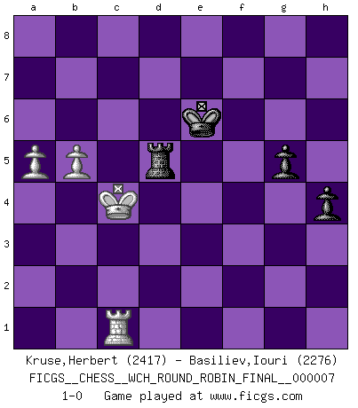 Last move : 1-0 2011 August 22 0:3:59 [Event "FICGS__CHESS__WCH_ROUND_ROBIN_FINAL__000007"] [Site "FICGS"] [Date "2011.04.01"] [Round "1"] [White "Kruse,Herbert"] [Black "Basiliev,Iouri"] [Result "1-0"] [WhiteElo "2417"] [BlackElo "2276"] 1.e4 c5 2.Nf3 d6 3.d4 cxd4 4.Nxd4 Nf6 5.Nc3 a6 6.h3 e5 7.Nde2 Nbd7 8.g4 Nc5 9.Bg2 b5 10.g5 Nfd7 11.Nd5 Nb6 12.Nxb6 Qxb6 13.Nc3 Qb7 14.f4 Be6 15.Qf3 b4 16.Nd5 Be7 17.Be3 Bxd5 18.exd5 Nd7 19.O-O-O a5 20.Kb1 a4 21.h4 O-O 22.Qh3 b3 23.cxb3 axb3 24.a3 exf4 25.Bxf4 Ra4 26.Be3 Rc8 27.Bd4 R8c4 28.Qe3 Qc8 29.Rc1 Ne5 30.Bxe5 Qf5+ 31.Ka1 dxe5 32.Rxc4 Rxc4 33.Qxb3 Qg4 34.Rf1 Rf4 35.Rc1 h5 36.Bf1 Qg1 37.Qb5 Qe3 38.Rc8+ Kh7 39.Bd3+ e4 40.d6 exd3 41.dxe7 Qe1+ 42.Ka2 Qxe7 43.Qxd3+ g6 44.Rd8 Rxh4 45.Qd7 Qxd7 46.Rxd7 Rg4 47.Rxf7+ Kg8 48.Rf1 Rxg5 49.b4 h4 50.Rh1 Rh5 51.a4 Kf7 52.a5 Ke6 53.Rd1 Rd5 54.Rc1 Rd6 55.Kb3 g5 56.b5 Rd5 57.Kc4 1-0 Sicilian : Najdorf, Adams attack Queenside Castling by player White (move 19) Kingside Castling by player Black (move 21) 10 pieces endgame at move 46 : White KRPPP , Black KRPPP WHITE : King + 1 Rook 3 Pawns BLACK : King + 1 Rook 3 Pawns 9 pieces endgame at move 47 : White KRPPP , Black KRPP WHITE : King + 1 Rook 3 Pawns BLACK : King + 1 Rook 2 Pawns 8 pieces endgame at move 48 : White KRPP , Black KRPP WHITE : King + 1 Rook 2 Pawns BLACK : King + 1 Rook 2 Pawns Player White won this chess game. Follow this game move after move (download)Chess is a terrific way for kids to build self image and self esteem. (Saudin Robovic) Wer mein Gambit spielt, muß bereit sein, alle Brücken hinter sich abzubrechen. Es verändert den ganzen Menschen. Es wirkt wie ein Zauberstab und fördert verkümmerte, gute Charakter- eigenschaften wieder zu Tage. (Emil Joseph Diemer) La batalla por la última verdad nunca sera ganada. Y es por eso que el Ajedrez es tan fascinante. (Hans Kmoch) Les écrivains ont utilisé les échecs pour analyser les côtés extrêmes de la nature humaine. Dans ce cadre, les échecs offrent un champ d'expérimentation idéal. Mais on pourrait faire la même chose avec la peinture. Et là, en vous référant à Van Gogh, vous ne tirerez pas de conclusion définitive sur les peintres. (Gary Kasparov) Every man's memory is his private literature. (Aldous Huxley)