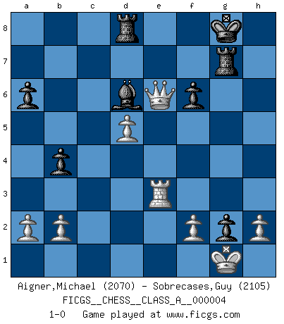 Last move : 1-0 2006 October 20 9:57:24 [Event "FICGS__CHESS__CLASS_A__000004"] [Site "FICGS"] [Date "2006.05.04"] [Round "1"] [White "Aigner,Michael"] [Black "Sobrecases,Guy"] [Result "1-0"] [WhiteElo "2070"] [BlackElo "2105"] 1.e4 c5 2.Qh5 e6 3.Nf3 Nc6 4.Ne5 Nxe5 5.Qxe5 d6 6.Qg3 Nf6 7.Nc3 a6 8.Be2 b5 9.Bf3 Nd7 10.e5 d5 11.O-O b4 12.Nxd5 exd5 13.Bxd5 Ra7 14.d4 Nb8 15.Bf3 cxd4 16.c3 h5 17.cxd4 h4 18.Qf4 h3 19.Be3 hxg2 20.Rfc1 g5 21.Qg3 g4 22.Bxg4 Bxg4 23.Qxg4 Nd7 24.Qf3 Rh7 25.Qf5 Rg7 26.d5 Rb7 27.e6 Nb6 28.Bxb6 Rxb6 29.e7 Bxe7 30.Rc8 Rb8 31.Rxd8+ Rxd8 32.Re1 Kf8 33.Qe5 f6 34.Qf5 Kg8 35.Re3 Bd6 36.Qe6+ 1-0 Sicilian defense Kingside Castling by player White (move 11) Player White won this chess game. Follow this game move after move (download)Bobby Fischer is the greatest Chess genius of all time ! (Alexander Kotov) Charakterschwächen offenbaren sich normalerweise während einer Schachpartie. (Garry Kasparov) Me siento como si fuera una pieza en una partida de Ajedrez, cuando mi oponente me indica: esa pieza no puede ser movida. (Soren Kierkegaard) Le génie consiste à savoir transgresser les règles au moment opportun. (Teichmann) History is a gallery of pictures in which there are few originals and many copies. (Alexis de Tocqueville)