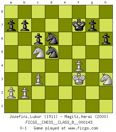 Last move : 0-1 2011 August 10 7:59:5 [Event "FICGS__CHESS__CLASS_B__000143"] [Site "FICGS"] [Date "2011.04.02"] [Round "1"] [White "Jozefini,Lubor"] [Black "Magitz,Aaral"] [Result "0-1"] [WhiteElo "1911"] [BlackElo "2000"] 1.e4 e5 2.f4 exf4 3.Qf3 Nc6 4.c3 Qh4+ 5.g3 fxg3 6.hxg3 Qe7 7.Qe3 f5 8.exf5 Qxe3+ 9.dxe3 d5 10.Bh3 Nge7 11.e4 dxe4 12.Bf4 Nxf5 13.Nd2 Bd6 14.Nxe4 Bxf4 15.gxf4 Ne3 16.Bxc8 Rxc8 17.Kf2 Nd5 18.Nh3 O-O 19.Kg3 Rce8 20.Rae1 Nce7 21.Rh2 Nf5+ 22.Kf3 c6 23.Rhe2 Re6 24.Neg5 Rxe2 25.Rxe2 h6 26.Ne6 Re8 27.Nc5 Rxe2 28.Kxe2 Nd6 29.Kf3 Kf7 0-1 KGA : Breyer gambit Kingside Castling by player Black (move 18) Player Black won this chess game. Follow this game move after move (download)Good positions don't win games, good moves do. (Gerald Abrahams) Ein guter Spieler hat immer Glück. (José Raúl Capablanca) El Ajedrez es la vida. (Bobby Fischer) En blitz, le Cavalier l'emporte sur le Fou. (Vlastimil Hort) The best teachers teach from the heart, not from the book. (Author unknown)