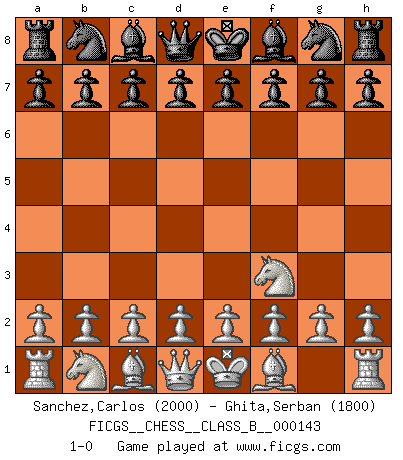 Last move : 1-0 2011 May 14 6:10:7 [Event "FICGS__CHESS__CLASS_B__000143"] [Site "FICGS"] [Date "2011.04.02"] [Round "1"] [White "Sanchez,Carlos"] [Black "Ghita,Serban"] [Result "1-0"] [WhiteElo "2000"] [BlackElo "1800"] 1.Nf3 1-0 This chess game has been lost on time (started : 2011.04.02 16:44:1) Reti Opening Player White won this chess game. Follow this game move after move (download)Before the endgame, the Gods have placed the middle game. (Siegbert Tarrasch) Ich brauche nur einen Blick auf das Schachbrett zu werfen, und weiß schon, was in der Stellung steckt, was geschehen kann und was geschehen wird. Alle übrigen suchen und prüfen, ich aber weiß es! (José Raúl Capablanca) En manos de Fischer's, una diminuta ventaja teórica es tan buena como tener una Reina de ventaja. (Isaac Kashdan) Les pièces de l'échiquier étaient impitoyables. Elles le retenaient, elles l'absorbaient. Il y avait de l'horreur en cela, mais aussi une harmonie unique. Car, qu'y a-t-il dans le monde, à part les échecs ? (V. Nabokov) When you stop learning you start dying. (Scott Adams)