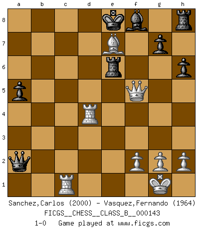 Last move : 1-0 2012 January 18 22:53:18 [Event "FICGS__CHESS__CLASS_B__000143"] [Site "FICGS"] [Date "2011.04.02"] [Round "1"] [White "Sanchez,Carlos"] [Black "Vasquez,Fernando"] [Result "1-0"] [WhiteElo "2000"] [BlackElo "1964"] 1.d4 d5 2.c4 dxc4 3.Nf3 Nf6 4.e3 Be6 5.Nc3 h6 6.Ne5 Nbd7 7.Nxc4 c6 8.e4 b5 9.Ne3 b4 10.d5 cxd5 11.exd5 Bf5 12.Nb5 Bh7 13.Nd4 a6 14.a3 bxa3 15.Bc4 Nb6 16.O-O Be4 17.Re1 Bxd5 18.Nxd5 Nfxd5 19.b3 Qd7 20.Rxa3 Nxc4 21.bxc4 Nb4 22.Rb3 a5 23.Rb2 Nc6 24.Rd2 Qc8 25.Nxc6 Qxc6 26.Rd6 Qxc4 27.Rd4 Qa2 28.Qf3 Rc8 29.Ba3 f5 30.Qxf5 Rc6 31.Bxe7 Re6 32.Rc1 1-0 QGA, Flohr variation Kingside Castling by player White (move 16) Player White won this chess game. Follow this game move after move (download)Not only will I predict his triumph over Botvinnik, but I'll go further and say that he'll probably be the greatest Chess player that ever lived. (John Collins) Spiel ein langweiliges Spiel zu Ende und lustige Dinge können passieren. (Hans Ree) Antes de los Finales, los dioses han colocado el Juego Medio. (Siegbert Tarrasch) Vous m'avez demandé de vous exposer quel est le fondement de la prière. Je ne fais que préparer les pièces du jeu sur la table... Nous sera-t-il permis d'en adopter les règles et si nous les appliquons scrupuleusement nous ne tarderons pas à faire mat le Roi divin ! Il ne pourra échapper à nos mains. (Sainte Thérèse d'Avila, Chemin de perfection) I fear not the man who has practiced 10,000 kicks once, but I fear the man who has practiced one kick 10,000 times. (Bruce Lee)