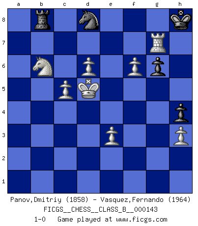 Last move : 1-0 2012 May 3 23:8:37 [Event "FICGS__CHESS__CLASS_B__000143"] [Site "FICGS"] [Date "2011.04.02"] [Round "1"] [White "Panov,Dmitriy"] [Black "Vasquez,Fernando"] [Result "1-0"] [WhiteElo "1858"] [BlackElo "1964"] 1.e4 e5 2.Nf3 Nf6 3.Nc3 Nc6 4.Bb5 Bc5 5.O-O O-O 6.d3 Nd4 7.Bc4 d6 8.h3 Be6 9.Nxd4 Bxd4 10.Bb3 c6 11.Qf3 a5 12.Ne2 Bb6 13.Qg3 Re8 14.Bh6 Nh5 15.Qg5 a4 16.Bxe6 Rxe6 17.Qxd8+ Rxd8 18.Be3 Bxe3 19.fxe3 Nf6 20.Rf2 d5 21.exd5 cxd5 22.Nc3 a3 23.bxa3 Ra8 24.Rb1 Rxa3 25.Rb3 Rxb3 26.axb3 Rc6 27.Nb5 Kf8 28.Kf1 Ke7 29.Ke1 Ra6 30.Kd2 h6 31.Kc3 Ra1 32.Kd2 Ra2 33.Rf1 Ra5 34.Nc3 Ke6 35.d4 e4 36.g4 g6 37.Ne2 Ra2 38.Nf4+ Ke7 39.Kc3 b6 40.Rc1 Ra8 41.Ne2 h5 42.g5 Ne8 43.Rf1 Ra2 44.Kd2 h4 45.Nc3 Ra5 46.b4 Ra6 47.Nxd5+ Kf8 48.b5 Ra7 49.Nxb6 Nd6 50.c4 Rb7 51.c5 Nxb5 52.Rb1 Na7 53.d5 Ke8 54.Rb4 Kf8 55.Rxe4 Kg7 56.d6 Rb8 57.Kd3 Nc6 58.Kc4 Nd8 59.Re8 f6 60.gxf6+ Kf7 61.Re7+ Kg8 62.Rg7+ Kh8 63.Kd5 1-0 Petrov Three knights game Kingside Castling by player White (move 5) Kingside Castling by player Black (move 5) Player White won this chess game. Follow this game move after move (download)He who takes the Queen's Knight's Pawn will sleep in the streets. (Anonymous) Ich habe Kasparov in Rente geschickt. (Veselin Topalov) Todo se encuentra en un estado de flujo y esto incluye al mundo del Ajedrez. (Mikhail Botvinnik) Psychologiquement, tu dois avoir confiance en toi même, mais cette confiance doit être basée sur des faits. (Robert Fischer) A person who never made a mistake never tried anything new. (Albert Einstein)