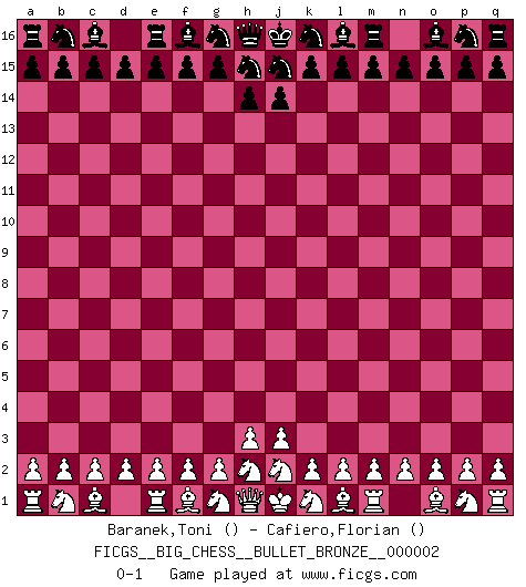 Last move : 0-1 2011 April 3 14:37:25 [Event "FICGS__BIG_CHESS__BULLET_BRONZE__000002"] [Site "FICGS"] [Date "2011.04.03"] [Round "1"] [White "Baranek,Toni"] [Black "Cafiero,Florian"] [Result "0-1"] [WhiteElo ""] [BlackElo ""] 0-1 This big chess game has been lost on time (started : 2011.04.03 14:29:32) Follow this game move after move (download)When the Chess game is over, the Pawn and the King go back to the same box. (Irish saying) Je mehr wir mit Computern analysieren, desto mehr glauben wir an Verteidigung. (Vladimir Kramnik) Un entendimiento a fondo de las continuaciones típicas del mate, hace de las combinaciones de sacrificio mas complicadas conducirlas a ellas no solo sin dificultad, sino casi de una manera natural. (Siegbert Tarrasch) Soyez une menace à chaque fois que vous vous asseyez pour jouer. (Ken Smith) Winning isn't everything... but losing is nothing. (Mednis)