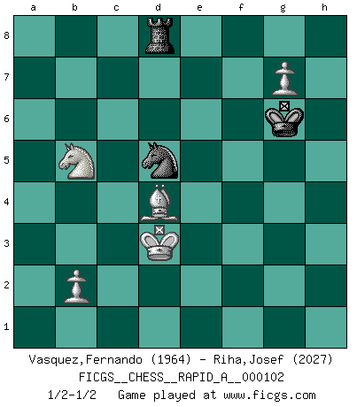 Last move : 1/2-1/2 2011 July 16 19:40:53 [Event "FICGS__CHESS__RAPID_A__000102"] [Site "FICGS"] [Date "2011.04.03"] [Round "1"] [White "Vasquez,Fernando"] [Black "Riha,Josef"] [Result "1/2-1/2"] [WhiteElo "1964"] [BlackElo "2027"] 1.e4 c5 2.d4 d6 3.dxc5 Qa5+ 4.Nc3 Qxc5 5.Be3 Qa5 6.Qd5 Qxd5 7.Nxd5 Kd8 8.Nf3 Nc6 9.O-O-O Bg4 10.Ng5 Nh6 11.Rd3 f6 12.Nf3 Bd7 13.h3 e6 14.Nc3 a6 15.Rd1 b5 16.Nd2 Nf7 17.a4 b4 18.Ne2 g6 19.Kb1 Kc7 20.Nc4 Rb8 21.a5 e5 22.Bb6+ Kb7 23.Ne3 Be7 24.Nc1 Be6 25.Bc4 Bxc4 26.Nxc4 Rhg8 27.Rd3 f5 28.f3 Bd8 29.Nb3 Be7 30.Bf2 h5 31.Rhd1 Rbd8 32.Nb6 Rge8 33.Nd5 Rb8 34.exf5 gxf5 35.f4 exf4 36.Nxf4 Nfe5 37.Rg3 h4 38.Rg7 Rg8 39.Rxe7+ Nxe7 40.Rxd6 N7c6 41.Bxh4 Kc7 42.Rf6 Rb5 43.Rxf5 Ng6 44.Rxb5 axb5 45.Nxg6 Rxg6 46.g4 Kd6 47.Bf2 Rg8 48.a6 Ra8 49.Nc5 Nb8 50.a7 Nc6 51.Nd3 b3 52.h4 bxc2+ 53.Kxc2 Nxa7 54.h5 Nc6 55.g5 Ke6 56.g6 Ne7 57.Bd4 Kf5 58.g7 Nd5 59.Ne5 Kg5 60.Nc6 Kxh5 61.Na7 Kg6 62.Nxb5 Rd8 63.Kd3 1/2-1/2 Sicilian : Smith-Morra gambit Queenside Castling by player White (move 9) 10 pieces endgame at move 53 : White KBNPPP , Black KRNP WHITE : King + 1 Bishop 1 Knight 3 Pawns BLACK : King + 1 Rook 1 Knight 1 Pawn 9 pieces endgame at move 60 : White KBNPP , Black KRNP WHITE : King + 1 Bishop 1 Knight 2 Pawns BLACK : King + 1 Rook 1 Knight 1 Pawn 8 pieces endgame at move 62 : White KBNPP , Black KRN WHITE : King + 1 Bishop 1 Knight 2 Pawns BLACK : King + 1 Rook 1 Knight This chess game ended in a draw. Follow this game move after move (download)He who takes the Queen's Knight's Pawn will sleep in the streets. (Anonymous) Wenn Du absolut nicht mehr weißt, was Du tun sollst, dann ist es Zeit für Panik. (John van der Wiel) La enorme capacidad mental, en la que sin ella no puede un jugador de Ajedrez existir, es demasiado requerida por el Ajedrez al grado de que nunca podrá liberar su mente de este juego. (Albert Einstein) Horreur, mais aussi harmonie suprême : qu'y avait-il en effet au monde en dehors des échecs ? Le brouillard, l'inconnu, le non-être... (Vladimir Nabokov) Perception is reality. (Immanuel Kant)
