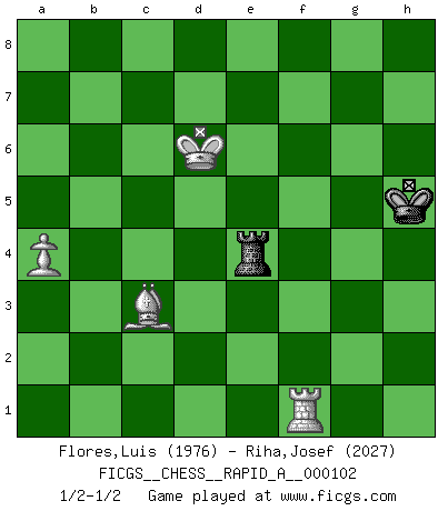 Last move : 1/2-1/2 2011 May 11 9:48:28 [Event "FICGS__CHESS__RAPID_A__000102"] [Site "FICGS"] [Date "2011.04.03"] [Round "1"] [White "Flores,Luis"] [Black "Riha,Josef"] [Result "1/2-1/2"] [WhiteElo "1976"] [BlackElo "2027"] 1.e4 c5 2.Nf3 d6 3.d4 cxd4 4.Nxd4 Nf6 5.Nc3 a6 6.Bg5 e6 7.f4 Qb6 8.Qd3 Qxb2 9.Rb1 Qa3 10.f5 Nc6 11.fxe6 fxe6 12.Nxc6 bxc6 13.Be2 Be7 14.Bh5+ Nxh5 15.Bxe7 Nf4 16.Qd4 e5 17.Qxe5 dxe5 18.Bxa3 Nxg2+ 19.Kf2 Nf4 20.Na4 Bh3 21.Nb6 Rd8 22.Nc4 c5 23.Bxc5 Be6 24.Nxe5 Rc8 25.Bd6 Ng6 26.Ke3 Nxe5 27.Bxe5 O-O 28.Rb2 Rc5 29.Bd4 Rg5 30.c3 Rg4 31.Rhb1 Rh4 32.Be5 Rh3+ 33.Bg3 h5 34.Kd4 h4 35.Bc7 Rf7 36.Bd6 Rd7 37.Ke5 Bc4 38.Rc2 Rd3 39.Bc5 a5 40.Bd4 Rf3 41.Rb8+ Kh7 42.Rc8 Bd3 43.Rd2 Re7+ 44.Kd6 Rxe4 45.Ra8 g5 46.Rxa5 Kh6 47.Ra8 g4 48.Rh8+ Kg5 49.a4 g3 50.Rg8+ Kh5 51.hxg3 hxg3 52.Rd1 Bf1 53.Rxg3 Rxg3 54.Rxf1 Rxc3 55.Bxc3 1/2-1/2 Sicilian : Najdorf, 7...Qb6 Kingside Castling by player Black (move 27) 10 pieces endgame at move 53 : White KRRBPP , Black KRRB WHITE : King + 2 Rooks 1 Bishop 2 Pawns BLACK : King + 2 Rooks 1 Bishop 9 pieces endgame at move 53 : White KRBPP , Black KRRB WHITE : King + 1 Rook 1 Bishop 2 Pawns BLACK : King + 2 Rooks 1 Bishop 8 pieces endgame at move 54 : White KRBPP , Black KRR WHITE : King + 1 Rook 1 Bishop 2 Pawns BLACK : King + 2 Rooks 7 pieces endgame at move 54 : White KRBP , Black KRR WHITE : King + 1 Rook 1 Bishop 1 Pawn BLACK : King + 2 Rooks 6 pieces endgame at move 55 : White KRBP , Black KR WHITE : King + 1 Rook 1 Bishop 1 Pawn BLACK : King + 1 Rook This chess game ended in a draw. Follow this game move after move (download)Suddenly it was obvious to me in my analysis I had missed what Fischer had found with the greatest of ease at the board. (Mikhail Botvinnik) Die größte Kunst beim Schach besteht darin dem Gegner nicht zu zeigen was er tun kann. (Garry Kasparov) Las piezas de Ajedrez son los bloques del alfabeto que moldean los pensamientos; y esos pensamientos, aunque hagan un diseño visual en el tablero, expresan abstractamente su belleza como un poema. (Marcel Duchamp) La tactique est l'élément le plus important du milieu de jeu. (Siegbert Tarrasch) The ultimate in disposing one's troops is to be without ascertainable shape. Then the most penetrating spies cannot pry in nor can the wise lay plans against you. (Sun Tzu)