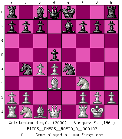 Last move : 0-1 2011 May 22 6:42:22 [Event "FICGS__CHESS__RAPID_A__000102"] [Site "FICGS"] [Date "2011.04.03"] [Round "1"] [White "Xristostomidis,Alkis"] [Black "Vasquez,Fernando"] [Result "0-1"] [WhiteElo "2000"] [BlackElo "1964"] 1.e4 e5 2.Nf3 Nf6 3.Nxe5 d6 4.Nf3 Nxe4 5.d4 d5 6.Bd3 Be7 7.O-O Nc6 8.c4 Nb4 0-1 This chess game has been lost on time (started : 2011.04.03 15:17:12) Petrov : Classical attack Kingside Castling by player White (move 7) Player Black won this chess game. Follow this game move after move (download)Every Chess master was once a beginner. (Chernev) Ja, jede Frau in Holland liebt mich bestimmt, und alle Männer hassen mich. (Loek van Wely) El juego del Ajedrez no es solamente una diversión quieta; algunas cualidades muy valuables de la mente se pueden adquirir y cultivar con el, como convertirlos en habitos disponibles para toda ocasión; ya que la vida es algo así como el Ajedrez. (Benjamin Franklin) Le thème de l'attaque double intervient d'une manière ou d'une autre dans l'immense majorité des combinaisons. (Youri Averbakh) The absolute truth is the thing that makes people laugh. (Carl Reiner)