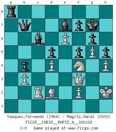 Last move : 1-0 2011 September 29 23:11:57 [Event "FICGS__CHESS__RAPID_A__000102"] [Site "FICGS"] [Date "2011.04.03"] [Round "1"] [White "Vasquez,Fernando"] [Black "Magitz,Aaral"] [Result "1-0"] [WhiteElo "1964"] [BlackElo "2000"] 1.e4 e6 2.d4 d5 3.e5 c5 4.c3 Nc6 5.Nf3 Qb6 6.Bd3 cxd4 7.cxd4 Bd7 8.Be2 Nge7 9.Nc3 Nf5 10.Na4 Qa5+ 11.Nc3 Qb6 12.Na4 Qa5+ 13.Nc3 b5 14.g4 b4 15.Nb1 Nfe7 16.Nbd2 h5 17.Nb3 Qb6 18.g5 Nf5 19.Be3 Be7 20.Bd3 Na5 21.Bxf5 Nxb3 22.Qxb3 exf5 23.O-O O-O 24.Rfc1 Rfc8 25.h4 g6 26.Bd2 Bf8 27.Bf4 Kg7 28.Qd1 Be7 29.Qd2 Bb5 30.Ne1 a5 31.Ng2 a4 32.Ne3 Qb7 33.b3 Bc6 34.Rab1 Bd7 35.Ng2 axb3 36.axb3 Ra3 37.Qd1 Ra2 38.Rxc8 Qxc8 39.Rc1 Qa6 40.Be3 Qb5 41.Rc7 Bd8 42.Rc5 Qb7 43.Nf4 Be7 44.Rc1 Bf8 45.Rc2 Ra3 46.Qb1 Be7 47.Kg2 Qa6 48.Qd1 Bd8 49.Rc5 Qb7 50.Rc1 Ra2 51.Kg1 Be7 52.Kh2 Bb5 53.Rc2 Ra3 54.Qf3 Bc6 55.Bc1 Ra6 56.Bd2 Ra8 57.e6 1-0 This chess game has been lost on time (started : 2011.04.03 15:17:12) French : Advance, Milner-Barry gambit Kingside Castling by player White (move 23) Kingside Castling by player Black (move 23) Player White won this chess game. Follow this game move after move (download)All I want to do, ever, is just play Chess. (Bobby Fischer) Im Blitz ist es einfacher mit einer Figur weniger anzugreifen, als sich mit einer Mehrfigur zu verteidigen. (Mikhail Nekhemyevich Tal) Un jugador que trata de regresar una movida en el Ajedrez es un futuro carterista. (Richard Fenton) Le pion, dans sa simplicité, marche droit devant lui, mais lorsqu'il prend, il le fait obliquement? Ainsi l'homme, tant qu'il reste pauvre, marche dans la droiture et vit honnêtement, mais lorsqu'il recherche les honneurs, il flatte, se parjure et, par les voies obliques, cherche une position supérieure sur l'échiquier du monde. (Jean de Galles) I take risks, sometimes patients die, but not taking risks causes more patients to die. So I guess my biggest problem is I've been cursed with the ability to do the math. (Gregory House, House M.D.)
