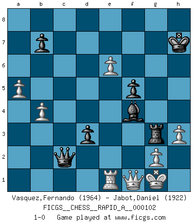 Last move : 1-0 2011 September 18 22:33:4 [Event "FICGS__CHESS__RAPID_A__000102"] [Site "FICGS"] [Date "2011.04.03"] [Round "1"] [White "Vasquez,Fernando"] [Black "Jabot,Daniel"] [Result "1-0"] [WhiteElo "1964"] [BlackElo "1922"] 1.e4 c5 2.d4 cxd4 3.c3 dxc3 4.Nxc3 Nc6 5.Nf3 d6 6.Bc4 e6 7.O-O Be7 8.Qe2 Nf6 9.Rd1 e5 10.h3 O-O 11.Be3 Be6 12.Nb5 Nxe4 13.Bxe6 fxe6 14.Nxa7 Nxa7 15.Bxa7 d5 16.Be3 Bf6 17.a3 Rc8 18.Nh2 h6 19.a4 Qe8 20.Ng4 Bh4 21.Rf1 Rf5 22.Bxh6 gxh6 23.Nxh6+ Kh7 24.Nxf5 exf5 25.Rad1 d4 26.a5 Qg6 27.f4 Ng3 28.Qb5 Rg8 29.fxe5 Nxf1 30.Qxf1 Bg5 31.Kh1 Be3 32.b3 Rg7 33.b4 Qe6 34.Qb5 Qa2 35.Qf1 Qc2 36.Re1 Rg3 37.Kh2 Bf4 38.Kg1 d3 39.e6 1-0 This chess game has been lost on time (started : 2011.04.03 15:17:12) Sicilian : Smith-Morra gambit Kingside Castling by player White (move 7) Kingside Castling by player Black (move 10) Player White won this chess game. Follow this game move after move (download)Discovered check is the dive bomber of the Chessboard. (Reuben Fine) Wenn Spassky eine Figur opfert kannst du genauso gut aufgeben. Aber wenn Tal eine Figur opfert, spiel weiter. Er könnte noch eine weitere opfern, und dann ... wer weiß? (Miguel Najdorf) Todavía soy una víctima del Ajedrez. Tiene toda la belleza del arte y mucho mas. No puede ser comercializado. El Ajedrez es mas puro que el arte en su posición social. (Marcel Duchamp) Même un GMI sait rarement calculer sur plus de cinq coups une attaque à sacrifices. (Rudolf Spielmann) No, no, you're not thinking; you're just being logical. (Niels Bohr)