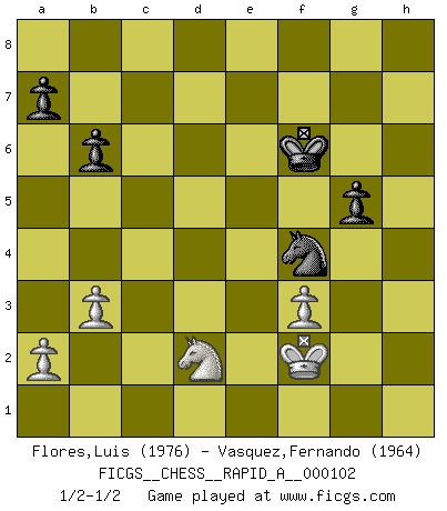 Last move : 1/2-1/2 2011 July 2 1:9:46 [Event "FICGS__CHESS__RAPID_A__000102"] [Site "FICGS"] [Date "2011.04.03"] [Round "1"] [White "Flores,Luis"] [Black "Vasquez,Fernando"] [Result "1/2-1/2"] [WhiteElo "1976"] [BlackElo "1964"] 1.e4 e5 2.Nf3 Nf6 3.Nc3 Nc6 4.Bb5 Bb4 5.O-O O-O 6.d3 d6 7.Bg5 Bxc3 8.bxc3 Qe7 9.Re1 h6 10.Bh4 Nd8 11.d4 Ne6 12.Bg3 Nh5 13.dxe5 dxe5 14.Bxe5 Ng5 15.Bxc7 Nh3+ 16.gxh3 Qxc7 17.Qd5 Nf4 18.Qe5 Nxh3+ 19.Kf1 Qxe5 20.Nxe5 Be6 21.Re3 Rfc8 22.Ba4 Rc5 23.Nd3 Rxc3 24.Rb1 b6 25.Bb3 Ng5 26.h4 Nh7 27.Rbe1 Rac8 28.Nf4 Bxb3 29.cxb3 Nf6 30.e5 Ng4 31.Rxc3 Rxc3 32.Kg2 Rc5 33.e6 fxe6 34.Rxe6 Kf7 35.Re2 Rc7 36.Kg3 Nf6 37.f3 Rd7 38.Rc2 g5 39.hxg5 hxg5 40.Ng2 Nh5+ 41.Kf2 Ke6 42.Ne3 Rd6 43.Nc4 Rd1 44.Re2+ Kf6 45.Rd2 Rxd2+ 46.Nxd2 Nf4 1/2-1/2 Petrov Three knights game Kingside Castling by player White (move 5) Kingside Castling by player Black (move 5) 10 pieces endgame at move 46 : White KNPPP , Black KNPPP WHITE : King + 1 Knight 3 Pawns BLACK : King + 1 Knight 3 Pawns This chess game ended in a draw. Follow this game move after move (download)It is the aim of the modern school, not to treat every position according to one general law, but according to the principle inherent in the position. (Richard Reti) Ich möchte Schüler heranbilden, die das Vermögen haben, selbst zu denken und Kritik zu üben. (Emanuel Lasker) El Rey es una pieza de pelea. ¡Usenlo!. (Wilhelm Steinitz) Je ne crois pas en la psychologie, je crois aux bons coups. (Robert Fischer) Locking firmely the window serves nothing, only small thiefs pass through there, the big thiefs enter through the front door. (Luc-Olivier Leclerc)