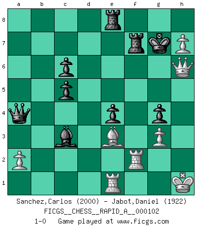 Last move : 1-0 2011 October 2 16:52:48 [Event "FICGS__CHESS__RAPID_A__000102"] [Site "FICGS"] [Date "2011.04.03"] [Round "1"] [White "Sanchez,Carlos"] [Black "Jabot,Daniel"] [Result "1-0"] [WhiteElo "2000"] [BlackElo "1922"] 1.f4 d5 2.Nf3 g6 3.g3 Bg7 4.Bg2 Nf6 5.O-O O-O 6.d3 c5 7.c3 Nc6 8.Na3 Re8 9.Qe1 Bg4 10.Ne5 Be6 11.Nxc6 bxc6 12.e4 Qb6 13.Qf2 Bc8 14.h3 e6 15.e5 Nd7 16.Rb1 Ba6 17.c4 Rab8 18.Bd2 f6 19.exf6 Bxf6 20.b3 Qc7 21.Nc2 Re7 22.Rfe1 Rbe8 23.h4 Bg7 24.Re2 e5 25.Rbe1 Qd6 26.Bh3 Bc8 27.Qf3 h5 28.Qg2 a6 29.Qf3 Rf8 30.Qf2 Ref7 31.Kh1 Kh8 32.Qg2 a5 33.Rg1 a4 34.bxa4 dxc4 35.dxc4 Qd3 36.Ne1 Qxc4 37.Nf3 Ba6 38.Rf2 e4 39.Ng5 Re7 40.Re1 Nf6 41.f5 Ng4 42.Bxg4 hxg4 43.fxg6 Rfe8 44.Be3 Qb4 45.Qg1 Qxa4 46.Nf7+ Kg8 47.h5 Bc4 48.h6 Bc3 49.h7+ Kg7 50.Qh2 Bxf7 51.gxf7 Rxf7 52.Qh6+ 1-0 Bird's Opening Kingside Castling by player White (move 5) Kingside Castling by player Black (move 5) Player White won this chess game. Follow this game move after move (download)All I want to do, ever, is just play Chess. (Bobby Fischer) Es ist wirklich schade, dass so viele Schachspieler nicht auf ihr Äußeres achten! (Alexandra Kosteniuk) Coloca el contenido del tablero de Ajedrez en un sombrero, agita las piezas vigorosamente, derrámalas en el tablero desde una altura de medio metro y así obtienes el estilo de Wilhelm Steinitz. (H. E. Bird) Il vaut mieux sacrifier les pièces de l'adversaire. (Xavier Tartacover) Always remember that you are unique; just like everyone else. (Unknown)