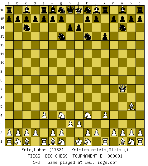 Last move : 1-0 2011 June 2 19:7:49 [Event "FICGS__BIG_CHESS__TOURNAMENT_B__000001"] [Site "FICGS"] [Date "2011.04.03"] [Round "1"] [White "Fric,Lubos"] [Black "Xristostomidis,Alkis"] [Result "1-0"] [WhiteElo "1752"] [BlackElo ""] 1.j2-k4 h15-g13 2.h1-o7 m15-m13 3.h2-g4 j15-k13 4.m2-m4 b16-c14 5.e2-e4 p16-o14 6.l1-p5 1-0 This big chess game has been lost on time (started : 2011.04.03 15:24:51) Follow this game move after move (download)If one piece is badly posted, the whole game is bad. (Tarrasch) Ich bewundere Kasparows phantasievolle Angriffssiege aus den Achtzigern und Neunzigern, aber wenn man sie mit dem Computer überprüft, nimmt der Computer in jeder zweiten Partie die Opfer an, verteidigt sich und gewinnt. (Vladimir Kramnik) Un entendimiento minucioso de las típicas continuaciones de mate hacen de las mas complicadas combinaciones de sacrificio que conducen hacia ellas no solo no dificiles, sino casi un asunto de rutina. (Siegbert Tarrasch) Les Echecs sont et restent toujours un combat, un combat intégral comme la boxe, la lutte ou un autre sport, et où il doit y avoir un vainqueur et un vaincu. (Joseph Emil Diemer) Question: Is 'This statement is paradoxical' a paradoxical statement ? Or is it a meta-paradox ? (Normajean Yates)