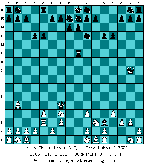 Last move : 0-1 2011 May 23 16:36:15 [Event "FICGS__BIG_CHESS__TOURNAMENT_B__000001"] [Site "FICGS"] [Date "2011.04.03"] [Round "1"] [White "Ludwig,Christian"] [Black "Fric,Lubos"] [Result "0-1"] [WhiteElo "1617"] [BlackElo "1752"] 1.n2-n4 j15-k13 2.h2-g4 e15-e13 3.j2-k4 h16-o10 4.o2-o3 m15-m13 5.e2-e4 n15-n13 6.o1-j6 f16-b12 7.h1-l4 o16-c5 8.h3-h4 m16-m14 9.g2-g3 m14-l14 10.l4-k5 c5-f8 11.g1-j2 o10-p9 12.p2-p3 d15-d13 13.f1-b5 l14-l5 14.k5-f1 g16-j15 15.e1-e3 f8-k4 16.j2-k4 b12-k4 17.j3-k4 l5-l2 18.f1-j4 l2-l11 19.k1-l3 l11-j11 20.j4-k5 c16-l8 21.h4-h5 l16-p12 22.j1-k1 l8-j6 23.h5-j6 p12-j6 24.k5-g5 j6-m3 0-1 Follow this game move after move (download)Chess, like love, like music, has the power to make people happy. (Siegbert Tarrasch) Im Schach gewinnt jeder. Hat man Freunde am Spiel - und das ist die Hauptsache - ist auch der Verlust einer Partie kein Unglück. (David Bronstein) Ciertamente el estado mental actual de Bobby Fischer es una tragedia. Uno de los mas grandes jugadores de Ajedrez del mundo -el orgullo y pena del Ajedrez Americano. (Frank Brady) J'ai toujours senti une vague pitié pour l'homme qui ne connaît rien aux échecs, tout comme j'en aurais pour un homme ignorant de l'amour. Les Echecs, comme la musique ou comme l'amour, ont le pouvoir de rendre heureux. (Siegbert Tarrasch) Wisdom doesn't necessarily come with age. Sometimes age just shows up all by itself. (Tom Watson)