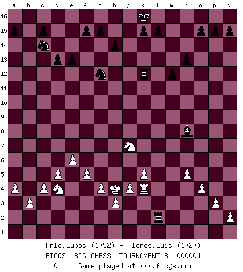 Last move : 0-1 2011 November 7 8:35:1 [Event "FICGS__BIG_CHESS__TOURNAMENT_B__000001"] [Site "FICGS"] [Date "2011.04.03"] [Round "1"] [White "Fric,Lubos"] [Black "Flores,Luis"] [Result "0-1"] [WhiteElo "1752"] [BlackElo "1727"] 1.j2-k4 p16-o14 2.h1-o7 h15-g13 3.o7-c7 j15-k13 4.c7-c10 k16-h15 5.m2-m4 b16-c14 6.h2-g4 g16-f14 7.e2-e4 e15-e13 8.d2-d4 m15-m13 9.n2-n4 n15-n13 10.f1-b5 d15-d13 11.b5-k13 j14-k13 12.c10-b9 o16-f8 13.g1-j2 q16-n16 14.o2-o3 m16-m14 15.b9-f9 h16-l13 16.m1-m3 f16-b12 17.m3-l3 l13-k14 18.l1-m2 l16-o13 19.l3-l6 n16-n14 20.l6-j6 j16-k16 21.j6-k6 k13-k12 22.c1-h6 f8-h6 23.g4-h6 c16-h11 24.f9-c9 k14-b6 25.c9-c3 b12-h6 26.k1-h2 b6-e9 27.f2-f3 h6-j5 28.k6-k12 j5-e1 29.c3-e1 m14-k14 30.k12-k14 n14-k14 31.o1-m3 e9-g9 32.g2-g4 g9-m4 33.m2-l3 m4-d12 34.d4-d5 e16-j16 35.c2-c4 j16-j12 36.p1-n2 a16-j16 37.l3-m4 d12-a9 38.e1-b4 j12-b12 39.b4-c3 m13-m12 40.b2-b3 h11-f9 41.b1-d2 f9-m3 42.k4-m3 a9-j9 43.m4-h8 j9-h10 44.j2-k4 b12-h12 45.h8-g7 h10-p10 46.p2-p3 p10-o9 47.n2-o4 h12-j12 48.j1-j2 k14-k7 49.g7-d4 o13-q11 50.f3-f4 k7-h7 51.k4-h5 q11-p10 52.m3-k4 h7-m7 53.k4-m5 o9-l9 54.l2-l3 l9-l4 55.h2-k3 m7-f7 56.f4-f5 f7-k7 57.m5-k6 l4-o7 58.a1-o1 p10-q9 59.o4-m5 o7-k11 60.d4-f2 k11-k10 61.c3-b4 j12-k12 62.b4-b15 k12-c12 63.b15-b4 k10-k12 64.b4-c3 g13-h11 65.f2-h4 h11-g9 66.h4-e7 k7-e7 67.c3-b4 e7-k7 68.d2-f3 g9-h7 69.b4-k12 c12-k12 70.k3-l5 k7-q7 71.l5-m7 h7-k6 72.m7-k6 q7-a7 73.a2-a4 j16-b16 74.f3-d4 h15-g13 75.d4-b5 a7-e7 76.o1-e1 b16-b9 77.e4-e5 o14-n12 78.e5-e6 b9-o9 79.o3-o4 o9-n9 80.q1-n1 n12-m10 81.l3-l4 g13-h11 82.j3-j4 q9-n6 83.n4-n5 m10-l8 84.k2-k3 l8-k6 85.h5-k6 h11-j9 86.j2-j3 e7-k7 87.e1-k1 j9-h7 88.k6-h7 k7-h7 89.n1-m1 n9-h9 90.m5-k4 h9-k9 91.k4-h5 n6-l4 92.k3-k4 l4-n6 93.m1-m6 n6-o7 94.k4-k5 h7-l7 95.m6-m2 l7-l3 96.j3-h4 k12-l12 97.h5-j7 k9-k11 98.k1-k2 f14-g12 99.j7-l6 k11-l11 100.b5-d4 o7-n8 101.k2-k4 l12-k12 102.l6-j7 l3-l2 103.m2-l2 l11-l2 0-1 Follow this game move after move (download)Half the variations which are calculated in a tournament game turn out to be completely superfluous. Unfortunately, no one knows in advance which half. (Jan Tinman) Drei Punkte vor allen anderen ist wie einer, der im weißen Anzug posiert, während der Rest in Müllsäcke gekleidet dasteht. (Viktor Kortschnoi) ¿Se han dado cuenta de que Fischer casi nunca ha tenido piezas malas? El las intercambia y las piezas malas se quedan con sus oponenets. (Yuri Balashov) Les échecs sont un jeu par leur forme, un art par leur essence et une science par sa difficulté d'acquisition. Ils peuvent vous procurer autant de plaisir qu'un bon livre ou une belle musique, mais vous n'aurez une réelle joie que si vous arrivez à bien jouer. (Tigran Petrosian) Don't be discouraged. It's often the last key in the bunch that opens the lock. (Author unknown)