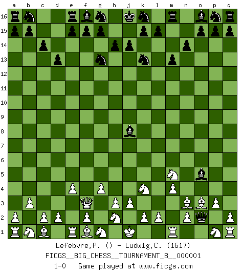 Last move : 1-0 2011 April 27 14:47:0 [Event "FICGS__BIG_CHESS__TOURNAMENT_B__000001"] [Site "FICGS"] [Date "2011.04.03"] [Round "1"] [White "Lefebvre,Pierre"] [Black "Ludwig,Christian"] [Result "1-0"] [WhiteElo ""] [BlackElo "1617"] 1.p2-p3 d15-d13 2.o1-p2 c15-c14 3.g2-g4 j15-k13 4.m2-m4 h16-o10 5.h1-f3 h15-g13 6.b2-b3 o10-o2 7.p2-o3 c16-o5 8.j2-k4 m15-m13 9.k1-l3 l16-o13 10.e2-e4 n15-n14 11.l3-m5 o13-j8 12.l1-n3 1-0 Follow this game move after move (download)When you play Bobby, it is not a question if you win or lose. It is a question if you survive. (Boris Spassky) Der Freibauer hat für mich eine Seele, genau wie der Mensch, Wünsche, die unerkannt in ihm schlummern, und Befürchtungen, von deren Existenz er selbst kaum ahnt. (Aaron Nimzowitsch) Hay dos clases de hombres: aquellos que se conforman en dejarse llevar por las circunstancias y que juegan barajas y aquellos decididos a controlar las circunstancias y que juegan al Ajedrez. (Mortimer Collins) Je ne crois pas en la psychologie, je crois aux bons coups. (Robert Fischer) If you don't practice you don't deserve to win. (Andre Agassi)