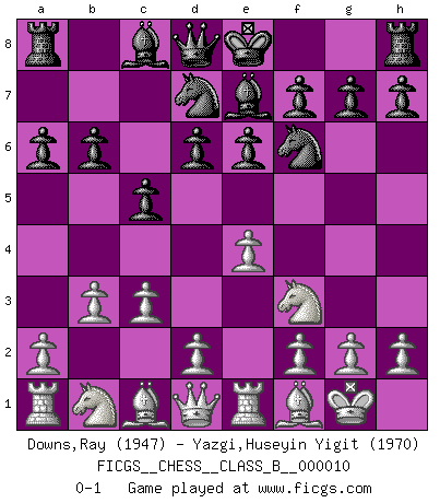 Last move : 0-1 2007 February 17 4:48:21 [Event "FICGS__CHESS__CLASS_B__000010"] [Site "FICGS"] [Date "2006.12.16"] [Round "1"] [White "Downs,Ray"] [Black "Yazgi,Huseyin Yigit"] [Result "0-1"] [WhiteElo "1947"] [BlackElo "1970"] 1.e4 c5 2.Nf3 e6 3.b3 d6 4.Bb5+ Nd7 5.O-O Ngf6 6.Re1 Be7 7.c3 a6 8.Bf1 b6 0-1 This chess game has been lost on time (started : 2006.12.16 22:7:14) Sicilian defense Kingside Castling by player White (move 5) Player Black won this chess game. Follow this game move after move (download)All Chess players should have a hobby. (Savielly Tartakower) Gegen einen Schachcomputer zu verlieren ist wie Löcher in den Strümpfen zuhaben. Es ist nicht peinlich, solange man der einzige ist der es weiß. (Anonymous) El arma más poderosa en el Ajedrez, es tener la próxima movida. (David Bronstein) Plusieurs personnes se sont demandées comment Tal faisait pour gagner... En fait, c'est très simple ! Il met ses pièces au centre de l'échiquier et les sacrifie quelque part ! (David Bronstein) Optimism is a variety of information deficit. Sometimes especially true for correspondence chess games. (Michael Aigner)
