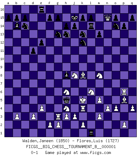 Last move : 0-1 2011 May 27 12:3:3 [Event "FICGS__BIG_CHESS__TOURNAMENT_B__000001"] [Site "FICGS"] [Date "2011.04.03"] [Round "1"] [White "Walden,Janeen"] [Black "Flores,Luis"] [Result "0-1"] [WhiteElo "1850"] [BlackElo "1727"] 1.j2-k4 p16-o14 2.h2-g4 j15-k13 3.b1-c3 h15-g13 4.p1-o3 e15-e13 5.e2-e4 d15-d13 6.f1-c4 m15-m13 7.d2-d3 n15-n13 8.c1-h6 g16-f14 9.m2-m4 b16-c14 10.l1-p5 k16-l14 11.n2-n3 h16-p9 12.o1-j6 l16-p12 13.h1-l4 p12-j6 14.l4-j6 c16-p4 15.q2-q4 f16-c13 16.e1-e3 o16-g9 17.e3-f3 a16-d16 18.m1-m3 e13-e12 19.o3-n5 p4-n2 20.g1-j2 n2-m3 21.l2-m3 p9-o8 22.o2-o4 o8-b8 23.k1-h2 b8-b2 24.a1-b1 b2-c3 25.q1-l1 c3-c2 26.b1-c1 c2-b2 27.j2-h4 e16-e13 28.j1-j2 c13-b14 29.h6-k8 e13-e14 30.c4-j10 e14-e16 31.c1-c6 l14-k12 32.j10-b3 b2-h8 33.k4-l6 h8-m12 34.h2-k3 m16-m14 35.g4-h6 m14-l14 36.l1-l4 q16-n16 37.b3-a4 j16-k16 38.c6-g6 m12-p12 39.j6-j4 n16-n14 40.h6-j8 g9-e11 41.n3-n4 d13-d12 42.m4-m5 d16-d13 43.a4-b5 d13-c13 44.b5-c4 l14-l10 45.l4-k4 n14-l14 46.l6-m8 l10-f10 47.h4-f5 f14-h13 48.f3-g3 p12-d1 49.g6-p6 p15-p14 50.n5-l6 f10-b10 51.c4-b3 d1-o1 52.j4-j6 c13-a13 53.j6-f6 b10-b8 54.f5-h6 d12-d11 55.f6-n13 e11-h8 56.n13-n15 k16-j15 57.k3-h4 b8-b3 58.a2-b3 a13-a1 59.j2-k3 o1-m1 60.k3-l4 a1-l1 61.l4-k5 m1-h5 0-1 Follow this game move after move (download)Live, lose, and learn, by observing your opponent how to win. (Amber Steenbock) Ich würde die 30 stärksten Spieler der USA im Simultanspiel besiegen. (José Raúl Capablanca) Combinaciones deslumbrantes son para la mayoría, mover madera es para los pocos. (Georg Kieninger) Il vaut mieux sacrifier les pièces de l'adversaire. (Xavier Tartacover) Indecision is the key to flexibility. (Unknown)