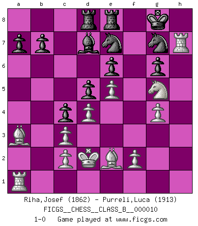 Last move : 1-0 2007 March 15 1:53:2 [Event "FICGS__CHESS__CLASS_B__000010"] [Site "FICGS"] [Date "2006.12.16"] [Round "1"] [White "Riha,Josef"] [Black "Purreli,Luca"] [Result "1-0"] [WhiteElo "1862"] [BlackElo "1913"] 1.e4 e6 2.d4 d5 3.Nc3 Bb4 4.e5 c5 5.a3 Bxc3+ 6.bxc3 c4 7.Qg4 g6 8.Be2 Nc6 9.Nf3 Nge7 10.a4 Bd7 11.a5 Nxa5 12.Qg5 Nac6 13.h4 Nf5 14.Qxd8+ Rxd8 15.h5 O-O 16.hxg6 fxg6 17.g4 Ng7 18.Rh6 Rf7 19.Ng5 Re7 20.Ba3 R7e8 21.Kd2 Ne7 22.Rxh7 1-0 French : Winawer, Advance variation Kingside Castling by player Black (move 15) Player White won this chess game. Follow this game move after move (download)Not only will I predict his triumph over Botvinnik, but I'll go further and say that he'll probably be the greatest Chess player that ever lived. (John Collins) Spiel ein langweiliges Spiel zu Ende und lustige Dinge können passieren. (Hans Ree) Buenas posiciones no logran ganar juegos, buenas movidas sí. (Gerald Abrahams) Echiquier : carré parfait, comme la Jérusalem nouvelle décrite par l'auteur de l'Apocalypse, huit cases sur huit, exaltation du chiffre 4, symbole du cosmos aux quatre horizons... où le noir et le blanc, l'ombre et la lumière, le mal et le bien s'entremêlent et se conjuguent. (Robert Couffignal, Le Gambit du poète) Question: Is 'This statement is paradoxical' a paradoxical statement ? Or is it a meta-paradox ? (Normajean Yates)
