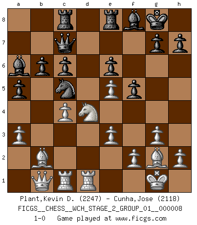 Last move : 1-0 2011 July 30 8:51:13 [Event "FICGS__CHESS__WCH_STAGE_2_GROUP_01__000008"] [Site "FICGS"] [Date "2011.04.03"] [Round "1"] [White "Plant,Kevin D."] [Black "Cunha,Jose"] [Result "1-0"] [WhiteElo "2247"] [BlackElo "2118"] 1.d4 d5 2.c4 c6 3.Nf3 e6 4.Nbd2 Nf6 5.g3 b6 6.Bg2 Be7 7.O-O Bb7 8.b3 O-O 9.Bb2 Nbd7 10.Rc1 Rc8 11.Ne5 Re8 12.e3 Nxe5 13.dxe5 Nd7 14.Qe2 f5 15.Nf3 Nc5 16.Nd4 Qd7 17.Rfd1 a6 18.Qc2 a5 19.Bf1 Ba6 20.a3 Bf8 21.Qb1 dxc4 22.bxc4 Qc7 23.Bg2 1-0 This chess game has been lost on time (started : 2011.04.03 20:55:28) QGD Slav : 3.Nf3 Kingside Castling by player White (move 7) Kingside Castling by player Black (move 8) Player White won this chess game. Follow this game move after move (download)A man without frontiers. He didn't divide the East and the West, he brought them together in their admiration for him. (Ljubomir Ljubojevic, about Bobby Fischer's death) Privat ist Kortschnoi kein schlechter Mensch, sehr sympathisch. Aber während des Spiels ist er grausam. Er will dich töten. (Miguel Najdorf) El tablero es el mundo, las piezas es el fenomeno del universo, las reglas del juego son lo que llamamos leyes de la naturaleza y el jugador del lado opuesto, se encuentra oculto a nuestra vista. (Thomas Huxley) J'ai toujours senti une vague pitié pour l'homme qui ne connaît rien aux échecs, tout comme j'en aurais pour un homme ignorant de l'amour. Les Echecs, comme la musique ou comme l'amour, ont le pouvoir de rendre heureux. (Siegbert Tarrasch) Life is painting a picture, not doing a sum. (Oliver Wendell Holmes, Jr.)