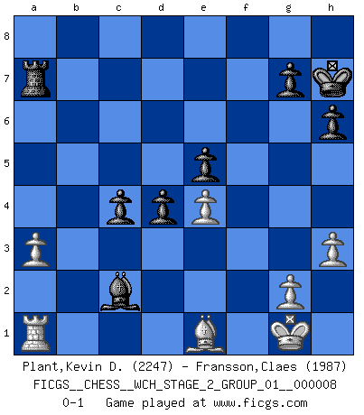 Last move : 0-1 2011 September 27 9:46:9 [Event "FICGS__CHESS__WCH_STAGE_2_GROUP_01__000008"] [Site "FICGS"] [Date "2011.04.03"] [Round "1"] [White "Plant,Kevin D."] [Black "Fransson,Claes"] [Result "0-1"] [WhiteElo "2247"] [BlackElo "1987"] 1.Nf3 e6 2.c4 Nf6 3.d4 Bb4+ 4.Nc3 b6 5.Qc2 Bb7 6.e3 O-O 7.Be2 c5 8.dxc5 Be4 9.Qb3 bxc5 10.O-O Bxc3 11.Qxc3 a5 12.b3 Qe7 13.Rd1 Nc6 14.Bb2 a4 15.bxa4 Rxa4 16.Ne5 d6 17.Nxc6 Bxc6 18.f3 Rfa8 19.a3 R4a6 20.Qd2 Ba4 21.Rdb1 h6 22.Bc3 Nd7 23.Rb7 Bc6 24.Rb3 R6a7 25.Rab1 d5 26.Ba1 f6 27.Bb2 Kh8 28.Bc1 Rd8 29.Qc3 R7a8 30.Bf1 d4 31.Qe1 e5 32.e4 Qd6 33.Bd3 Ba4 34.Rb7 Rdb8 35.Qf2 Kh7 36.Qe2 Rxb7 37.Rxb7 Nb6 38.Qb2 Ra6 39.f4 Bd7 40.Qf2 Qc6 41.fxe5 fxe5 42.Rb8 Be6 43.Qh4 Nc8 44.Qh5 Qc7 45.Rb1 Bf7 46.Qe2 Nd6 47.Qc2 Bg6 48.Bb2 Qc6 49.Re1 Bf7 50.Rc1 Ra4 51.Qe2 Qb7 52.h3 Qb3 53.Qc2 Qxc2 54.Bxc2 Ra7 55.Ra1 Nxc4 56.Bc1 Na5 57.Bd2 Bb3 58.Bxa5 Bxc2 59.Be1 c4 0-1 Reti Opening Kingside Castling by player Black (move 6) Kingside Castling by player White (move 10) Player Black won this chess game. Follow this game move after move (download)It is difficult to play against Einstein's theory --on his first loss to Fischer. (Mikhail Tal) Die FIDE ist dabei in die Hände der russischen Mafia zu fallen. (Larry Evans) Cuando no sepas que mover, espera por una idea que se le venga a la la cabeza de tu oponente. Tenlo por seguro de que esa idea estará incorrecta. (Siegbert Tarrasch) Les sacrifices démontrent seulement que quelqu'un a gaffé. (Savielly Tartacover) The next best thing to gambling and winning is gambling and loosing. (Nick Dandalos)