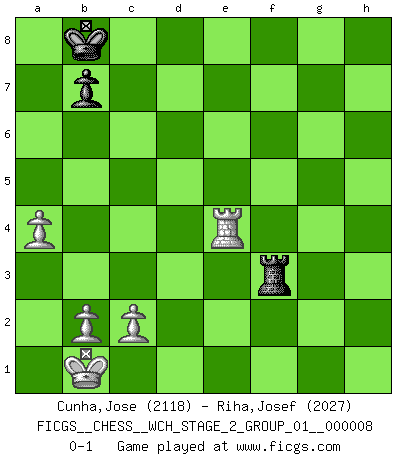 Last move : 0-1 2011 July 30 8:51:13 [Event "FICGS__CHESS__WCH_STAGE_2_GROUP_01__000008"] [Site "FICGS"] [Date "2011.04.03"] [Round "1"] [White "Cunha,Jose"] [Black "Riha,Josef"] [Result "0-1"] [WhiteElo "2118"] [BlackElo "2027"] 1.e4 c5 2.Nf3 Nc6 3.d4 cxd4 4.Nxd4 Qc7 5.Nc3 Nf6 6.Ndb5 Qd8 7.Nd5 Nxd5 8.exd5 a6 9.Nc3 Ne5 10.f4 Ng6 11.Qd4 e5 12.fxe5 Qe7 13.Bf4 Nxf4 14.Qxf4 d6 15.e6 fxe6 16.dxe6 Qxe6+ 17.Be2 Bd7 18.O-O-O O-O-O 19.Kb1 Qe5 20.Qc4+ Qc5 21.Qb3 Bc6 22.Bf3 Bxf3 23.gxf3 d5 24.Nxd5 Bd6 25.Rhg1 g6 26.h4 Kb8 27.h5 gxh5 28.a4 Qc6 29.Rg7 h4 30.Rd3 Be5 31.Re7 Rde8 32.Rf7 Rhf8 33.Nb4 Qc8 34.Rxh7 Rh8 35.Rf7 Rhf8 36.Rxf8 Rxf8 37.Rd5 Bc7 38.Nxa6+ Ka7 39.Nxc7 Qxc7 40.Rh5 Kb8 41.Rxh4 Qg3 42.Re4 Qxf3 43.Qxf3 Rxf3 0-1 This chess game has been lost on time (started : 2011.04.03 20:55:28) Sicilian : Flohr variation Queenside Castling by player White (move 18) Queenside Castling by player Black (move 18) 10 pieces endgame at move 42 : White KQRPPP , Black KQRP WHITE : King + 1 Queen 1 Rook 3 Pawns BLACK : King + 1 Queen 1 Rook 1 Pawn 9 pieces endgame at move 43 : White KQRPPP , Black KRP WHITE : King + 1 Queen 1 Rook 3 Pawns BLACK : King + 1 Rook 1 Pawn 8 pieces endgame at move 43 : White KRPPP , Black KRP WHITE : King + 1 Rook 3 Pawns BLACK : King + 1 Rook 1 Pawn Player Black won this chess game. Follow this game move after move (download)You cannot play at Chess if you are kind-hearted. (French Proverb) Als ich elf wurde, wurde ich einfach gut. (Robert James Fischer) No todos los artistas son jugadores de Ajedrez, pero todos los jugadores de Ajedrez son artistas. (Marcel Duchamp) Même si vous avez un bon coup à faire, regardez toujours s'il n'y en a pas un qui lui soit préférable. (Pedro Damiano) Somehow our devils are never quite what we expect when we meet them face to face. (Nelson DeMille)