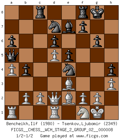 Last move : 1/2-1/2 2011 May 29 23:17:55 [Event "FICGS__CHESS__WCH_STAGE_2_GROUP_02__000008"] [Site "FICGS"] [Date "2011.04.03"] [Round "1"] [White "Bencheikh,Ilf"] [Black "Tsenkov,Ljubomir"] [Result "1/2-1/2"] [WhiteElo "1980"] [BlackElo "2349"] 1.e4 c5 2.Nf3 d6 3.d4 cxd4 4.Nxd4 Nf6 5.Nc3 a6 6.h3 e5 7.Nde2 h5 8.Bg5 Be6 9.Ng3 Nbd7 10.Be2 g6 11.Bf3 Be7 12.O-O Nh7 13.Be3 Rc8 14.Re1 O-O 15.Qd2 b5 16.Be2 h4 17.Nf1 Nhf6 18.a4 b4 19.Nd5 Bxd5 20.exd5 Qa5 21.Red1 Ne4 1/2-1/2 Sicilian : Najdorf, Adams attack Kingside Castling by player White (move 12) Kingside Castling by player Black (move 14) This chess game ended in a draw. Follow this game move after move (download)Kasparov : J'adoube , Ivanchuk : S'il vous plaît ! (Garry Kasparov & Vassily Ivanchuk, Linares 1997) Ich würde die 30 stärksten Spieler der USA im Simultanspiel besiegen. (José Raúl Capablanca) Los libros de Ajedrez deben de usarse igual como usamos los anteojos: para mejorar la vista, aunque algunos jugadores los quieren usar como si ellos les otorgaran la vision. (José Raúl Capablanca) Ce qui est bien, c'est d'avoir tout un tas de pièces en prise : l'adversaire ne peut en prendre qu'une à la fois. Cité par Thierry Audin. If you have any trouble condescending, find a Unix user to show you how it's done. (Scott Adams)