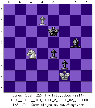 Last move : 1/2-1/2 2011 July 19 8:30:8 [Event "FICGS__CHESS__WCH_STAGE_2_GROUP_02__000008"] [Site "FICGS"] [Date "2011.04.03"] [Round "1"] [White "Comes,Ruben"] [Black "Fric,Lubos"] [Result "1/2-1/2"] [WhiteElo "2247"] [BlackElo "2214"] 1.e4 c5 2.Nf3 d6 3.h3 Nf6 4.c3 Nc6 5.Qc2 e5 6.Bc4 Be7 7.O-O O-O 8.d3 a6 9.a4 d5 10.exd5 Nxd5 11.Nbd2 Be6 12.Re1 Qc7 13.Nf1 Kh8 14.Bd2 f6 15.Ng3 Rad8 16.Rac1 Bf7 17.Kh1 g5 18.Rcd1 Bg6 19.Ba2 Qd7 20.Qc1 Nf4 21.Bxf4 gxf4 22.Nh4 Kg7 23.Nxg6 hxg6 24.Nf1 f3 25.Qe3 fxg2+ 26.Kxg2 Rh8 27.Qf3 Rh4 28.Ne3 Rf4 29.Qd5 Qe8 30.Qb3 Na5 31.Qb6 Rd6 32.Qxc5 Rxa4 33.b4 b6 34.Qc7 Rxa2 35.bxa5 Rxa5 36.Nc4 Rc6 37.Qa7 Rb5 38.Kg1 Qf7 39.Qxa6 Rbc5 40.Qa7 Bf8 41.Ra1 b5 42.Qxf7+ Kxf7 43.Na5 Ra6 44.c4 e4 45.d4 Rg5+ 46.Kf1 Bb4 47.Nb7 Rxa1 48.Rxa1 bxc4 49.Rc1 Rb5 50.Nd8+ Ke7 51.Nc6+ Kd7 52.Rxc4 Bd6 53.h4 Rh5 54.Na7 Rxh4 55.Nc8 Rh1+ 56.Kg2 Rd1 57.Nb6+ Ke6 58.Ra4 Bc7 59.d5+ Kf5 60.Nc4 Bf4 61.Ra5 g5 62.Rb5 g4 63.Rc5 Rd3 64.Kf1 g3 65.fxg3 Rxg3 66.Ke2 Rd3 67.Rb5 Rd4 68.Rc5 Kg5 69.Ne3 f5 70.Nc4 Bh2 71.Kf2 Bf4 72.Ke2 Kg4 73.d6 Kg5 74.Rc6 Kf6 75.d7 Ke7 76.Nb6 Bg5 77.Rc8 f4 78.Ke1 Ke6 79.Rc6+ Rd6 80.Rxd6+ Kxd6 81.Nc4+ Ke6 82.Kf1 f3 83.Kf2 1/2-1/2 Comment by player 1 : Ruben Comes : I made a mistake with the mouse in the middle game. My opponent I returned the courtesy. Sicilian Kingside Castling by player White (move 7) Kingside Castling by player Black (move 7) 10 pieces endgame at move 65 : White KRNPP , Black KRBPP WHITE : King + 1 Rook 1 Knight 2 Pawns BLACK : King + 1 Rook 1 Bishop 2 Pawns 9 pieces endgame at move 65 : White KRNP , Black KRBPP WHITE : King + 1 Rook 1 Knight 1 Pawn BLACK : King + 1 Rook 1 Bishop 2 Pawns 8 pieces endgame at move 80 : White KRNP , Black KBPP WHITE : King + 1 Rook 1 Knight 1 Pawn BLACK : King + 1 Bishop 2 Pawns 7 pieces endgame at move 80 : White KNP , Black KBPP WHITE : King + 1 Knight 1 Pawn BLACK : King + 1 Bishop 2 Pawns This chess game ended in a draw. Follow this game move after move (download)Nonsense was the last thing Fischer was interested in, as far as Chess was concerned. (Elie Agur) Schach ist wie eine schöne Frau, zu der wir ständig zurückkehren, gleichviel, wie oft sie uns zurückweist. (Anonymous) El arma más poderosa en el Ajedrez, es tener la próxima movida. (David Bronstein) C'est la seule position que je connaisse où les deux camps sont mals. Propos prêtés à V. Anand. Children in the dark cause accidents, accidents in the dark cause children. (Unknown)