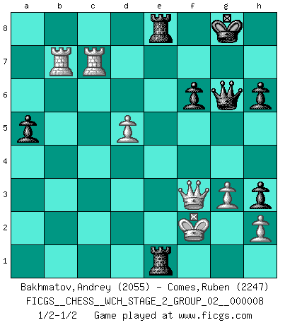 Last move : 1/2-1/2 2011 June 14 17:20:10 [Event "FICGS__CHESS__WCH_STAGE_2_GROUP_02__000008"] [Site "FICGS"] [Date "2011.04.03"] [Round "1"] [White "Bakhmatov,Andrey"] [Black "Comes,Ruben"] [Result "1/2-1/2"] [WhiteElo "2055"] [BlackElo "2247"] 1.e4 c5 2.Nf3 d6 3.d4 cxd4 4.Nxd4 Nf6 5.Nc3 a6 6.Bg5 e6 7.f4 Qb6 8.Qd2 Qxb2 9.Rb1 Qa3 10.e5 h6 11.Bh4 dxe5 12.fxe5 g5 13.exf6 gxh4 14.Be2 Qa5 15.O-O Nd7 16.Rf4 h3 17.Qe3 Qg5 18.g3 Bc5 19.Ne4 Qd5 20.c3 e5 21.Rf5 Kf8 22.Rd1 Bb6 23.Rh5 exd4 24.cxd4 Qxa2 25.Bf3 Nxf6 26.Nxf6 Qe6 27.Ne4 Kg7 28.Kh1 Re8 29.Qc3 Qc6 30.Rc5 Qg6 31.d5 f6 32.Rc4 a5 33.Rb1 Bf5 34.Rxb6 Bxe4 35.Rxb7+ Kg8 36.Kg1 Bxf3 37.Qxf3 Re1+ 38.Kf2 Rae8 39.R4c7 1/2-1/2 Sicilian : Najdorf, 7...Qb6 Kingside Castling by player White (move 15) This chess game ended in a draw. Follow this game move after move (download)You sit at the board and suddenly your heart leaps. Your hand trembles to pick up the piece and move it. But what Chess teaches you is that you must sit there calmly and think about whether it's really a good idea and whether there are other better ideas. (Stanley Kubrick) Karpov ist ein Museumsstück. (Garry Kasparov) El Ajedrez no es una pizca de inferior al violín, y tenemos un gran número de violinistas profesionales. (Mikhail Botvinnik) Les Echecs, c'est l'art de la guerre sans les charniers, c'est la résurrection des morts tombés au champ d'honneur, l'espoir perpétuel, la suprématie de l'intelligence sur la force, la culture de l'esprit. (F. Szpiner) War is the child of passion, passion is the child of narcissism and narcissism is the child. (...) Another game ? (Thibault de Vassal)
