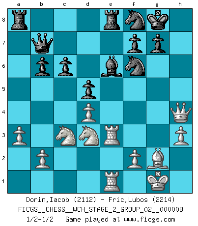 Last move : 1/2-1/2 2011 July 9 20:45:4 [Event "FICGS__CHESS__WCH_STAGE_2_GROUP_02__000008"] [Site "FICGS"] [Date "2011.04.03"] [Round "1"] [White "Dorin,Iacob"] [Black "Fric,Lubos"] [Result "1/2-1/2"] [WhiteElo "2112"] [BlackElo "2214"] 1.Nf3 Nf6 2.g3 d5 3.d4 Bf5 4.Bg2 c6 5.c4 e6 6.Nc3 h6 7.Qb3 Qb6 8.c5 Qc7 9.Bf4 Qc8 10.Nd2 Be7 11.O-O O-O 12.e4 Bh7 13.Rac1 Rd8 14.Rfd1 Nbd7 15.Re1 Bf8 16.exd5 exd5 17.Nf3 Bf5 18.h3 Nh5 19.Bd2 Nhf6 20.a3 b6 21.cxb6 Qb7 22.Ne5 axb6 23.g4 Be6 24.Ng6 Bd6 25.Bf4 Bxf4 26.Nxf4 Nf8 27.Nd3 h5 28.g5 Ne4 29.Qd1 Nxg5 30.Qxh5 Ngh7 31.Re3 Re8 32.Rce1 Nf6 33.Qg5 N8h7 34.Qh4 Nf8 1/2-1/2 Reti Opening Kingside Castling by player White (move 11) Kingside Castling by player Black (move 11) This chess game ended in a draw. Follow this game move after move (download)Chess makes man wiser and clear-sighted. (Vladimir Putin) Auf jeden Fall musst du zuerst Rechtsanwalt werden, damit du deine eigenen Interessen und die deiner Familie vertreten kannst. [Brief an seinen Sohn] (José Raúl Capablanca) El Ajedrez es imaginación. (David Bronstein) Karpov est une pièce de musée. (Garry Kasparov) Remember : Your focus determines your reality. (Qui-Gon Jinn in Star Wars ep.1)