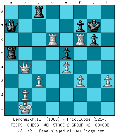 Last move : 1/2-1/2 2011 August 24 18:15:43 [Event "FICGS__CHESS__WCH_STAGE_2_GROUP_02__000008"] [Site "FICGS"] [Date "2011.04.03"] [Round "1"] [White "Bencheikh,Ilf"] [Black "Fric,Lubos"] [Result "1/2-1/2"] [WhiteElo "1980"] [BlackElo "2214"] 1.e4 c5 2.Nf3 d6 3.d4 cxd4 4.Nxd4 Nf6 5.Nc3 a6 6.h3 e6 7.g4 h6 8.Bg2 Be7 9.Be3 Nc6 10.Qe2 Nxd4 11.Bxd4 e5 12.Be3 b5 13.a3 Be6 14.O-O-O Rc8 15.Qd2 Nd7 16.Kb1 Nb6 17.Bf1 O-O 18.Rg1 Nc4 19.Bxc4 Rxc4 20.Nd5 Bxd5 21.Qxd5 Qc7 22.c3 Rc8 23.Rd3 a5 24.g5 hxg5 25.Bxg5 Rc5 26.Qb3 Bxg5 27.Rxg5 Kf8 28.Rf5 Qb7 29.Ka1 g6 30.Rf6 Kg7 31.R3xd6 b4 32.f3 Qc7 33.axb4 axb4 34.Qxb4 Ra5+ 35.Kb1 Qa7 1/2-1/2 Sicilian : Najdorf, Adams attack Queenside Castling by player White (move 14) Kingside Castling by player Black (move 17) This chess game ended in a draw. Follow this game move after move (download)A player surprised is half beaten. (Proverb) Gott hat gewollt, dass ich Champion werde. (Surab Azmajparaschvili) Una buena ofensiva y una buena defensa, comienzan ambas con un buen desarrollo. (Bruce A. Moon) J'ai vu le vaincu d'Echecs jouer des années durant dans l'espoir de la fête de la victoire. Car tu es plus riche de ce qu'elle existe si même elle n'est point pour toi. Ainsi de la perle du fond des mers. (Antoine de Saint-Exupéry) The mind is like a parachute, it only functions when its open. (Unknown)