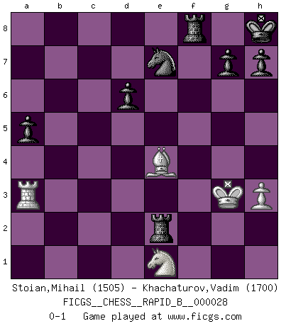 Last move : 0-1 2007 January 20 18:5:59 [Event "FICGS__CHESS__RAPID_B__000028"] [Site "FICGS"] [Date "2006.12.17"] [Round "1"] [White "Stoian,Mihail"] [Black "Khachaturov,Vadim"] [Result "0-1"] [WhiteElo "1505"] [BlackElo "1700"] 1.e4 c5 2.Nf3 d6 3.d4 cxd4 4.Nxd4 e5 5.Nb3 Be6 6.Bd3 Nf6 7.O-O Nc6 8.Bg5 Be7 9.Nc3 Nxe4 10.Bxe7 Nxc3 11.Bxd8 Nxd1 12.Raxd1 Rxd8 13.Rfe1 O-O 14.c4 Nb4 15.Bb1 Bxc4 16.Nc1 f5 17.b3 Be6 18.h3 Nc6 19.Nd3 f4 20.b4 f3 21.b5 Nd4 22.a4 Bb3 23.Rd2 fxg2 24.Re3 Bxa4 25.Ra2 Bxb5 26.Rxa7 Ba6 27.Kxg2 Nc6 28.Ba2+ Kh8 29.Rxa6 bxa6 30.Bd5 Ne7 31.Bb7 a5 32.Ne1 Rb8 33.Bf3 Rb2 34.Ra3 e4 35.Bxe4 Rbxf2+ 36.Kg3 Re2 0-1 Sicilian Kingside Castling by player White (move 7) Kingside Castling by player Black (move 13) Player Black won this chess game. Follow this game move after move (download)If your opponent cannot do anything active, then don't rush the position; instead you should let him sit there, suffer, and beg you for a draw. (Jeremy Silman) Ich habe die besten Aussichten, den ersten Preis zu gewinnen - denn jeder muss gegen Steinitz spielen, nur ich nicht! (Wilhelm Steinitz) Haz el enroque temprano y seguido. (Rob Sillars) Les échecs sont utiles à l'exercice de la faculté de penser et à celle de l'imagination. Car nous devons posséder une méthode élaborée pour atteindre des buts partout où nous devons conduire notre raison. (Leibnitz) There is no vagueness without wind. (Chinese proverb)