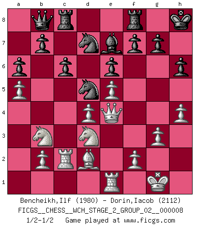 Last move : 1/2-1/2 2011 August 2 3:58:55 [Event "FICGS__CHESS__WCH_STAGE_2_GROUP_02__000008"] [Site "FICGS"] [Date "2011.04.03"] [Round "1"] [White "Bencheikh,Ilf"] [Black "Dorin,Iacob"] [Result "1/2-1/2"] [WhiteElo "1980"] [BlackElo "2112"] 1.e4 c6 2.d4 d5 3.e5 Bf5 4.Be3 e6 5.Nd2 Nd7 6.Ngf3 Ne7 7.Be2 Qb6 8.Nb3 Bg4 9.a4 Nf5 10.a5 Qc7 11.O-O Be7 12.Bf4 O-O 13.c3 Bh5 14.h3 Bg6 15.c4 dxc4 16.Bxc4 Rad8 17.Qe2 h6 18.Rfc1 a6 19.Bd3 Rfe8 20.g3 Qb8 21.Be4 Bf8 22.Ne1 Ne7 23.Nd3 Bxe4 24.Qxe4 Nd5 25.Bd2 Rc8 26.Rc2 Be7 27.Re1 Kh8 28.h4 Rf8 1/2-1/2 Caro-Kann : Advance variation Kingside Castling by player White (move 11) Kingside Castling by player Black (move 12) This chess game ended in a draw. Follow this game move after move (download)Blessed be the memory of him who gave the world this immortal game. (A. G. Gardiner) Die FIDE ist dabei in die Hände der russischen Mafia zu fallen. (Larry Evans) No existe un remordimiento como el remordimiento del Ajedrez. (H. G. Wells) Les ravages du H expliquent la différence de niveau entre Tal et Thal [Abergel]. Art disturbs, science reassures. (Georges Braque, Le Jour et la Nuit)
