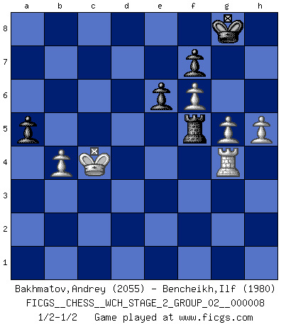 Last move : 1/2-1/2 2011 June 29 16:9:36 [Event "FICGS__CHESS__WCH_STAGE_2_GROUP_02__000008"] [Site "FICGS"] [Date "2011.04.03"] [Round "1"] [White "Bakhmatov,Andrey"] [Black "Bencheikh,Ilf"] [Result "1/2-1/2"] [WhiteElo "2055"] [BlackElo "1980"] 1.d4 d5 2.c4 c6 3.Nf3 Nf6 4.Nc3 e6 5.Bg5 dxc4 6.e4 b5 7.e5 h6 8.Bh4 g5 9.Nxg5 hxg5 10.Bxg5 Nbd7 11.g3 Bb7 12.Bg2 Qb6 13.exf6 c5 14.d5 O-O-O 15.O-O b4 16.Na4 Qb5 17.a3 Nb8 18.axb4 cxb4 19.Qg4 Bxd5 20.Rfc1 Nc6 21.Bxd5 Rxd5 22.Rxc4 Rxg5 23.Qd4 Kb8 24.Rxc6 Rxg3+ 25.fxg3 Qxc6 26.Rd1 Qc7 27.b3 Kc8 28.Qe3 Kb8 29.Qd2 Bc5+ 30.Nxc5 Qxc5+ 31.Qd4 Qc3 32.Qxc3 bxc3 33.Rc1 Rc8 34.Kf2 Rc5 35.g4 Kc7 36.Ke3 Kd6 37.Kd3 Ke5 38.g5 Kf5 39.h4 Rd5+ 40.Kxc3 a5 41.Kc4 Kg6 42.Ra1 Rf5 43.Rh1 Kh5 44.Kd4 Rd5+ 45.Ke4 Rf5 46.Rh2 Kg6 47.h5+ Kh7 48.Rg2 Kg8 49.Rg3 Kf8 50.Kd3 Kg8 51.Rg4 Rf3+ 52.Kc4 Rf5 53.b4 1/2-1/2 QGD Slav : 4.Nc3 Queenside Castling by player Black (move 14) Kingside Castling by player White (move 15) This chess game ended in a draw. Follow this game move after move (download)A Chess game is divided into three stages: the first, when you hope you have the advantage, the second when you believe you have an advantage, and the third... when you know you're going to lose ! (Savielly Tartakower) Wenn du gegen Bobby spielst, ist es keine Frage von gewinnen oder verlieren. Es ist eine Frage des Überlebens. (Boris Vassilievich Spassky) Existen dos clases de sacrificios: los correctos y los míos. (Mikhail Tal) Les échecs sont utiles à l'exercice de la faculté de penser et à celle de l'imagination. Car nous devons posséder une méthode élaborée pour atteindre des buts partout où nous devons conduire notre raison. (Leibnitz) Lottery : A tax on people who are bad at math. (Author unknown)