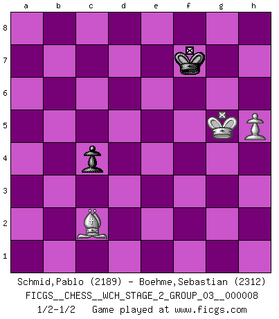 Last move : 1/2-1/2 2011 October 18 22:46:52 [Event "FICGS__CHESS__WCH_STAGE_2_GROUP_03__000008"] [Site "FICGS"] [Date "2011.04.03"] [Round "1"] [White "Schmid,Pablo"] [Black "Boehme,Sebastian"] [Result "1/2-1/2"] [WhiteElo "2189"] [BlackElo "2312"] 1.e4 e5 2.Nf3 Nc6 3.Bc4 Bc5 4.b4 Bxb4 5.c3 Ba5 6.d4 exd4 7.O-O Nf6 8.e5 Ne4 9.Re1 Nc5 10.Bg5 Ne7 11.Nxd4 h6 12.Qh5 Ne6 13.Nxe6 dxe6 14.Rd1 Bd7 15.Rd3 Qc8 16.Bxe7 Kxe7 17.Nd2 Bb6 18.Ne4 Bc6 19.a4 a6 20.a5 Ba7 21.Rad1 Qg8 22.Bb3 Qh7 23.Rf3 Qg6 24.Qh4+ Ke8 25.Bc2 Bxe4 26.Bxe4 Qg5 27.Qxg5 hxg5 28.Bxb7 Rd8 29.Rxd8+ Kxd8 30.Rxf7 Rh4 31.Rxg7 Ra4 32.Kf1 Rxa5 33.Rxg5 Ra2 34.f4 Rf2+ 35.Ke1 Rxf4 36.Bxa6 Bg1 37.h3 Re4+ 38.Kd2 c5 39.Bb7 Rf4 40.Rg6 Kd7 41.Rg7+ Ke8 42.Bc8 Rf5 43.Rg6 Rxe5 44.Rxe6+ Rxe6 45.Bxe6 Ke7 46.Ba2 Bh2 47.Ke3 Kf6 48.Kf3 Be5 49.c4 Kg5 50.g3 Bc3 51.Kf2 Kf5 52.Bb1+ Ke5 53.Kf3 Bd2 54.Ke2 Bc3 55.h4 Bb2 56.Kf3 Bc3 57.Kg4 Be1 58.Kh3 Bc3 59.Bc2 Bd2 60.Kg2 Kd4 61.Kf3 Kxc4 62.Ke2 Bc1 63.g4 Kd5 64.Kf3 c4 65.g5 Ke6 66.Kg4 Bd2 67.h5 Bxg5 68.Kxg5 Kf7 1/2-1/2 Evans gambit Kingside Castling by player White (move 7) 10 pieces endgame at move 44 : White KRBPPP , Black KRBP WHITE : King + 1 Rook 1 Bishop 3 Pawns BLACK : King + 1 Rook 1 Bishop 1 Pawn 9 pieces endgame at move 44 : White KBPPP , Black KRBP WHITE : King + 1 Bishop 3 Pawns BLACK : King + 1 Rook 1 Bishop 1 Pawn 8 pieces endgame at move 45 : White KBPPP , Black KBP WHITE : King + 1 Bishop 3 Pawns BLACK : King + 1 Bishop 1 Pawn 7 pieces endgame at move 61 : White KBPP , Black KBP WHITE : King + 1 Bishop 2 Pawns BLACK : King + 1 Bishop 1 Pawn 6 pieces endgame at move 67 : White KBP , Black KBP WHITE : King + 1 Bishop 1 Pawn BLACK : King + 1 Bishop 1 Pawn 5 pieces endgame at move 68 : White KBP , Black KP WHITE : King + 1 Bishop 1 Pawn BLACK : King + 1 Pawn This chess game ended in a draw. Follow this game move after move (download)Modern Chess is too much concerned with things like Pawn structure. Forget it, Checkmate ends the game. (Nigel Short) Immer nach dem besten Zug zu suchen ist ziemlich unpraktisch. (Nigel Short) Un buen sacrificio es aquel que aunque no sea necesariamente sólido, deja a tu oponente aturdido y confuso. (Rudolph Spielmann) Le profane ne songe pas à la somme de jouissance dont il se prive, qui méconnaît ce jeu aux ressources aussi variées que passionnantes. (Jean-Marie Jeanton-Lamarche) To be champion requires more than simply being a strong player; one has to be a strong human being as well. (Anatoly Karpov)