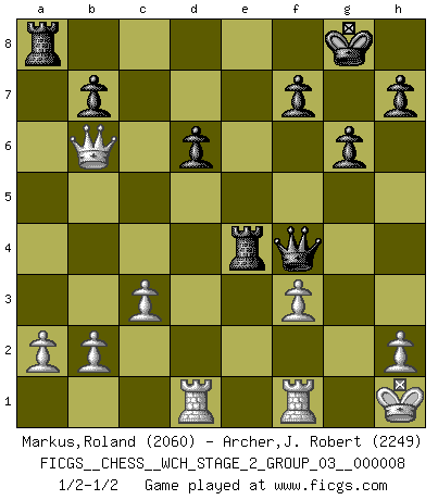 Last move : 1/2-1/2 2011 July 30 23:30:30 [Event "FICGS__CHESS__WCH_STAGE_2_GROUP_03__000008"] [Site "FICGS"] [Date "2011.04.03"] [Round "1"] [White "Markus,Roland"] [Black "Archer,J. Robert"] [Result "1/2-1/2"] [WhiteElo "2060"] [BlackElo "2249"] 1.e4 e5 2.Nf3 Nc6 3.d4 exd4 4.Nxd4 Bc5 5.Be3 Qf6 6.c3 Nge7 7.Bc4 Ne5 8.Be2 Qg6 9.O-O d6 10.f3 O-O 11.Nd2 d5 12.Kh1 dxe4 13.fxe4 Bg4 14.Bf4 Bxe2 15.Qxe2 Bd6 16.Nb5 N7c6 17.Rad1 Rad8 18.Nf3 Rfe8 19.Nxd6 cxd6 20.Bxe5 Nxe5 21.Nh4 Qg4 22.Qf2 g6 23.Nf3 Nxf3 24.gxf3 Qf4 25.Qxa7 Ra8 26.Qb6 Rxe4 1/2-1/2 Scotch game Kingside Castling by player White (move 9) Kingside Castling by player Black (move 10) This chess game ended in a draw. Follow this game move after move (download)As one by one I mowed them down, my superiority soon became apparent. (Jose Capablanca) Bis jetzt ist Weiß einer wohlbekannten Analyse gefolgt. Aber jetzt begeht er einen schrecklichen Fehler: Er beginnt seinen eigenen Kopf zu benutzen. (Siegbert Tarrasch) Los errores estan ahí, esperando a que se cometan. (Savielly Tartakower) Vous savez, camarade Pachman, je n'éprouve pas de plaisir à être ministre, je jouerais plutôt aux échecs comme vous, ou alors ferais une révolution au Venezuela. (Che Guevara à Ludek Pachman, 'Checkmate in Prague', 1975) Ah, the Socrating method. The best way we have of teaching everything-apart from juggling chainsaws. (Gregory House, House M.D.)
