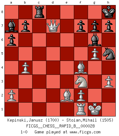 Last move : 1-0 2007 January 19 7:2:44 [Event "FICGS__CHESS__RAPID_B__000028"] [Site "FICGS"] [Date "2006.12.17"] [Round "1"] [White "Kepinski,Janusz"] [Black "Stoian,Mihail"] [Result "1-0"] [WhiteElo "1700"] [BlackElo "1505"] 1.e4 c5 2.c3 d5 3.exd5 Qxd5 4.d4 cxd4 5.cxd4 Nf6 6.Nc3 Qd8 7.Nf3 Bg4 8.h3 Bh5 9.Bb5+ Nbd7 10.O-O a6 11.Be2 e6 12.d5 exd5 13.Nxd5 Bc5 14.Bf4 O-O 15.b4 Ba7 16.Rc1 Rc8 17.Rxc8 Qxc8 18.Ne7+ Kh8 19.Nxc8 Rxc8 20.g4 Bg6 21.g5 Nh5 22.Qxd7 1-0 Sicilian : Alapin's variation (2.c3) Kingside Castling by player White (move 10) Kingside Castling by player Black (move 14) Player White won this chess game. Follow this game move after move (download)The tactician knows what to do when there is something to do; whereas the strategian knows what to do when there is nothing to do. (Gerald Abrahams) Das Schachspiel übertrifft alle anderen Spiele so weit wie der Chimborasso einen Misthaufen. (Arthur Schopenhauer) No es suficiente ser un buen jugador, se debe también de jugar bién. (Siegbert Tarrasch) Celui qui prend des risques peut perdre, celui qui n'en prend pas perd toujours. (Xavier Tartacover) Sometimes it pays to stay in bed in Monday, rather than spending the rest of the week debugging Monday's code. (Dan Salomon)