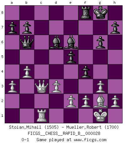 Last move : 0-1 2007 January 12 7:9:16 [Event "FICGS__CHESS__RAPID_B__000028"] [Site "FICGS"] [Date "2006.12.17"] [Round "1"] [White "Stoian,Mihail"] [Black "Mueller,Robert"] [Result "0-1"] [WhiteElo "1505"] [BlackElo "1700"] 1.Nf3 Nf6 2.c4 c5 3.g3 d5 4.Bg2 Nc6 5.cxd5 Nxd5 6.O-O e5 7.Nc3 Be6 8.d3 Be7 9.a3 O-O 10.Qc2 Nb6 11.Ne4 Nd4 12.Nxd4 cxd4 13.Bd2 Rc8 14.Qd1 f5 15.Nc3 dxc3 16.Bxc3 Qc7 17.Rc1 Nd5 18.Qa4 Nxc3 19.Rxc3 Qb6 20.Qc2 Rxc3 21.Qxc3 Bd6 22.b4 g6 23.Rc1 f4 0-1 Reti Opening Kingside Castling by player White (move 6) Kingside Castling by player Black (move 9) Player Black won this chess game. Follow this game move after move (download)Chess is the gymnasium of the mind. (Blaise Pascal) Kasparov ist eine Art Monster mit hundert Augen, denen auch nicht das Geringste entgeht. (Tony Miles) El poder defensivo de una pieza clavada, solamente es imaginario. (Aaron Nimzovich) Le système Elo représente seulement une moyenne. Il est simplement un indicateur de votre stabilité. (Anatoli Karpov) Nothing is more important for teaching us to understand the concepts we have than constructing fictitious ones. (Ludwig Wittgenstein)