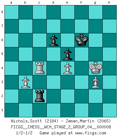 Last move : 1/2-1/2 2011 July 5 21:15:45 [Event "FICGS__CHESS__WCH_STAGE_2_GROUP_04__000008"] [Site "FICGS"] [Date "2011.04.03"] [Round "1"] [White "Nichols,Scott"] [Black "Zeman,Martin"] [Result "1/2-1/2"] [WhiteElo "2184"] [BlackElo "2065"] 1.e4 c5 2.Nf3 d6 3.Nc3 Nf6 4.d4 cxd4 5.Nxd4 a6 6.Be3 e5 7.Nf3 Qc7 8.a4 Be7 9.a5 O-O 10.Be2 Be6 11.O-O Nbd7 12.Ng5 Bc4 13.Bxc4 Qxc4 14.Ra4 Qc6 15.Qe2 Rfc8 16.Rd1 Bd8 17.Nf3 Ng4 18.Bd2 b5 19.axb6 Bxb6 20.Be1 Ngf6 21.b3 a5 22.h3 g6 23.Nh2 Bc5 24.Ng4 Bb4 25.Nxf6+ Nxf6 26.Rd3 Qb7 27.Bd2 h5 28.Qf3 Kg7 29.Qe3 Kg8 30.Kh2 Ra6 31.f4 Rac6 32.f5 Qe7 33.fxg6 fxg6 34.Ra1 Ng4+ 35.hxg4 Qh4+ 36.Qh3 Qxh3+ 37.Kxh3 Bxc3 38.Bxc3 Rxc3 39.gxh5 gxh5 40.Rxa5 Kf7 41.g3 Ke6 42.Rxc3 Rxc3 43.Ra2 Re3 44.Ra4 Kf6 45.Kh4 Re2 46.Kxh5 Rh2+ 47.Kg4 Rxc2 48.Rc4 1/2-1/2 Sicilian Kingside Castling by player Black (move 9) Kingside Castling by player White (move 11) 10 pieces endgame at move 46 : White KRPPPP , Black KRPP WHITE : King + 1 Rook 4 Pawns BLACK : King + 1 Rook 2 Pawns 9 pieces endgame at move 47 : White KRPPP , Black KRPP WHITE : King + 1 Rook 3 Pawns BLACK : King + 1 Rook 2 Pawns This chess game ended in a draw. Follow this game move after move (download)Chess is a terrible game. If you have no center, your opponent has a freer position. If you do have a center, then you really have something to worry about ! (Siegbert Tarrasch) Rubinstein ist ein Turmendspiel, welches die Götter vor tausenden von Jahren begannen. (Savielly Grigorievitsch Tartakower) Sin errores no puede haber brillantez. (Emanuel Lasker) Le jeu d'échecs est comme rejeté hors du temps. (Antoine de Saint-Exupéry) Life is pain my dear and anyone who says otherwise is selling something. (Princess Bride)