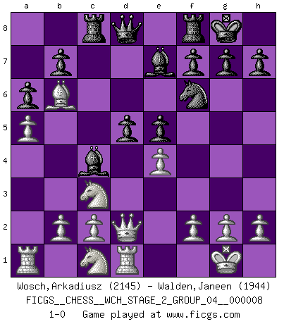 Last move : 1-0 2011 June 14 20:2:51 [Event "FICGS__CHESS__WCH_STAGE_2_GROUP_04__000008"] [Site "FICGS"] [Date "2011.04.03"] [Round "1"] [White "Wosch,Arkadiusz"] [Black "Walden,Janeen"] [Result "1-0"] [WhiteElo "2145"] [BlackElo "1944"] 1.e4 c5 2.Nf3 d6 3.d4 cxd4 4.Nxd4 Nf6 5.Nc3 a6 6.Be2 e5 7.Nb3 Be7 8.O-O O-O 9.Be3 Be6 10.Qd2 Nbd7 11.a4 Nb6 12.a5 Nc4 13.Bxc4 Bxc4 14.Rfd1 Rc8 15.Nc1 d5 16.Bb6 1-0 Sicilian : Najdorf, Opovcensky variation Kingside Castling by player White (move 8) Kingside Castling by player Black (move 8) Player White won this chess game. Follow this game move after move (download)Bobby Fischer's current state of mind is indeed a tragedy. One of the world's greatest Chess players - the pride and sorrow of American Chess. (Frank Brady) Ein unbeabsichtigtes Patt ist der Gipfel der Dummheit. (Anonymous) Una buena memoria, concentración, imaginación y una fuerte voluntad, se requiere para llegar a ser un buen jugador. (Bobby Fischer) Il a essayé de se convaincre qu'il pourrait empêcher toutes les erreurs et ne jamais perdre. L'horreur ! Gary Kasparov au sujet de Robert Fischer. Wisdom doesn't necessarily come with age. Sometimes age just shows up all by itself. (Tom Wilson)