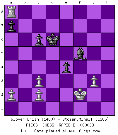 Last move : 1-0 2007 January 16 18:48:28 [Event "FICGS__CHESS__RAPID_B__000028"] [Site "FICGS"] [Date "2006.12.17"] [Round "1"] [White "Glover,Brian"] [Black "Stoian,Mihail"] [Result "1-0"] [WhiteElo "1400"] [BlackElo "1505"] 1.e4 e6 2.Nf3 c5 3.Nc3 Nc6 4.g3 d5 5.Bg2 Nf6 6.d3 dxe4 7.dxe4 Qxd1+ 8.Nxd1 Nxe4 9.O-O f5 10.Nc3 Nxc3 11.bxc3 h6 12.Bf4 g5 13.Bd2 Bg7 14.Rad1 Kf7 15.Rfe1 Na5 16.Ne5+ Bxe5 17.Rxe5 Rd8 18.Rxc5 Nc6 19.Bf3 Rd6 20.h4 Kf6 21.Bxg5+ hxg5 22.Rxd6 gxh4 23.Bxc6 bxc6 24.Rd8 Ke7 25.Rh8 Kd6 26.Ra5 hxg3 27.fxg3 e5 28.Kf2 e4 29.Rxf5 Bxf5 30.Rxa8 1-0 French defense Kingside Castling by player White (move 9) Player White won this chess game. Follow this game move after move (download)A sacrifice is best refuted by accepting it. (Wilhelm Steinitz) Kasparov stellt für gewöhnlich die Regeln auf und bricht sie dann selbst wieder. (Alexej Shirov) Los errores estan ahí, esperando a que se cometan. (Savielly Tartakower) Il vaut toujours mieux jouer un plan faux de façon logique que de n'avoir pas de plan du tout. (Victor Kortchnoï) Without deviation from the norm, progress is not possible. (Frank Zappa)