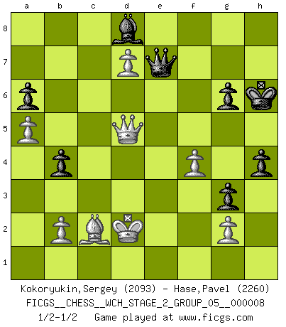 Last move : 1/2-1/2 2011 June 8 17:23:3 [Event "FICGS__CHESS__WCH_STAGE_2_GROUP_05__000008"] [Site "FICGS"] [Date "2011.04.03"] [Round "1"] [White "Kokoryukin,Sergey"] [Black "Hase,Pavel"] [Result "1/2-1/2"] [WhiteElo "2093"] [BlackElo "2260"] 1.d4 Nf6 2.c4 e6 3.Nf3 d5 4.Nc3 Be7 5.Bf4 O-O 6.e3 c5 7.dxc5 Bxc5 8.Be2 dxc4 9.Bxc4 a6 10.Bd3 Nbd7 11.O-O b5 12.a4 b4 13.Ne4 Bb7 14.Ne5 Be7 15.Nxf6+ Nxf6 16.Re1 Ne4 17.Qb1 f5 18.f3 Nf6 19.Bc4 Nd5 20.Qd3 Bf6 21.Bg3 Qe7 22.Rac1 Rad8 23.Bb3 Rd6 24.Qe2 Bg5 25.Qf2 Re8 26.h4 Bf6 27.a5 R6d8 28.Nc6 Bxc6 29.Rxc6 Kh8 30.e4 f4 31.exd5 fxg3 32.Qb6 Qf7 33.Rcxe6 Bxh4 34.Rxe8+ Rxe8 35.Rxe8+ Qxe8 36.Kf1 h5 37.d6 Bd8 38.Qc5 Qg6 39.Ke2 Qe8+ 40.Kd2 Kh7 41.f4 h4 42.Qd5 Kh6 43.Bc2 g6 44.d7 Qe7 1/2-1/2 Queen's pawn game Kingside Castling by player Black (move 5) Kingside Castling by player White (move 11) This chess game ended in a draw. Follow this game move after move (download)Morphy was probably the greatest genius of them all. (Bobby Fischer) Im Schach nämlich geht es darum, daß Ich des Gegners klein zu kriegen, sein Ego zu zerbrechen und zu zermahlen, seine Selbstachtung zu zertreten und zu verscharren und seine ganze mißachtenswerte sogenannte Persönlichkeit ein für alle Mal tot zu hacken und zu zerstampfen und dadurch die menschliche Gesellschaft von einer stinkenden Pestbeule zu befreien. Es ist ein königliches Spiel. (Robert James Fischer) Siempre es mucho mejor sacrificar las piezas de tu oponente. (Savielly Tartakover) Les échecs sont plus proches de l'art de l'assassinat que de l'art de la guerre. (Arturo Perez-Reverte) Who needs drugs and alcohol if he can play Big Chess at FICGS ? (Heinz-Georg Lehnhoff)
