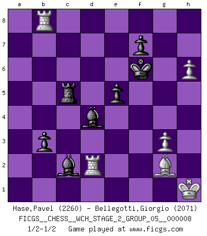 Last move : 1/2-1/2 2011 May 7 19:44:43 [Event "FICGS__CHESS__WCH_STAGE_2_GROUP_05__000008"] [Site "FICGS"] [Date "2011.04.03"] [Round "1"] [White "Hase,Pavel"] [Black "Bellegotti,Giorgio"] [Result "1/2-1/2"] [WhiteElo "2260"] [BlackElo "2071"] 1.e4 c5 2.Nf3 d6 3.d4 cxd4 4.Nxd4 Nf6 5.Nc3 a6 6.Bg5 e6 7.f4 Qb6 8.Qd2 Qxb2 9.Rb1 Qa3 10.e5 h6 11.Bh4 dxe5 12.fxe5 g5 13.exf6 gxh4 14.Be2 Qa5 15.O-O Nd7 16.Rf4 h3 17.Qe3 Qe5 18.Ne4 Bc5 19.c3 Rg8 20.g3 b5 21.Bg4 Nb6 22.Qd3 Nd5 23.Rf2 Bb6 24.Bxh3 Bd7 25.Bg2 Rc8 26.Kh1 Rg4 27.Re2 Nxc3 28.Nxc3 Rxd4 29.Qh7 Qxf6 30.Nd5 Rxd5 31.Bxd5 Bd4 32.Rd1 e5 33.R2e1 Bf5 34.Rf1 Bxh7 35.Rxf6 Rc5 36.Bg2 a5 37.Rxh6 Bg6 38.Rh8+ Ke7 39.h4 b4 40.h5 Bc2 41.Rd2 a4 42.h6 b3 43.axb3 axb3 44.Rb8 Kf6 1/2-1/2 Sicilian : Najdorf, 7...Qb6 Kingside Castling by player White (move 15) This chess game ended in a draw. Follow this game move after move (download)I have never in my life played the French Defence, which is the dullest of all openings. (Wilhelm Steinitz) Jeder leidlich begabte Spieler, er braucht keineswegs hervorragend veranlagt zu sein, kann es zum Meister bringen. Aber das ist ja auch gar nicht nötig! Der richtige Standpunkt ist es, zu seinem Vergnügen zu spielen, und man glaube ja nicht, dass der Genuss proportional dem Können sei. (Siegbert Tarrasch) Si yo gano un torneo, yo lo gano por mí mismo. Yo hago las jugadas. Nadie me ayuda. (Bobby Fischer) On entre au jeu d'Echecs comme on entre en Religion. Pour le joueur d'Echecs, la partie d'Echecs c'est l'office, la messe, le défilé du 1er Mai, le dépôt de gerbe au Monument aux Morts. C'est un drame sacré. (Michel Roos) Optimism is a variety of information deficit. Sometimes especially true for correspondence chess games. (Michael Aigner)