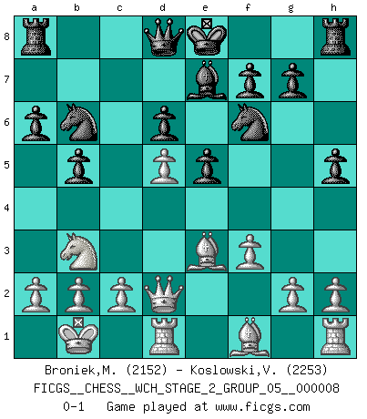 Last move : 0-1 2011 June 9 19:24:8 [Event "FICGS__CHESS__WCH_STAGE_2_GROUP_05__000008"] [Site "FICGS"] [Date "2011.04.03"] [Round "1"] [White "Broniek,Mariusz Maciej"] [Black "Koslowski,Volker"] [Result "0-1"] [WhiteElo "2152"] [BlackElo "2253"] 1.e4 c5 2.Nf3 d6 3.d4 cxd4 4.Nxd4 Nf6 5.Nc3 a6 6.Be3 e5 7.Nb3 Be6 8.f3 h5 9.Qd2 Nbd7 10.O-O-O Be7 11.Kb1 b5 12.Nd5 Bxd5 13.exd5 Nb6 0-1 This chess game has been lost on time (started : 2011.04.03 21:9:44) Sicilian : Najdorf, Byrne (English) attack Queenside Castling by player White (move 10) Player Black won this chess game. Follow this game move after move (download)A Chess game is a dialogue, a conversation between a player and his opponent. Each move by the opponent may contain threats or be a blunder, but a player cannot defend against threats or take advantage of blunders if he does not first ask himself: What is my opponent planning after each move ? (Bruce A. Moon) Aljechin war kein Nazi. Er war ein Opportunist. Ein schrecklicher Mann. Er liebte Geld über alles und würde für Geld ein Jude, ein Katolik oder ein Protestant werden. (Miguel Najdorf) El Ajedrez es 99 por ciento táctica. (Teichmann) Le succès, c'est être capable d'aller d'échec en échec sans perdre son enthousiasme. (Winston Churchill) He is a liar. I just don't know what the lie is yet. (Horatio Caine, C.S.I. Miami)
