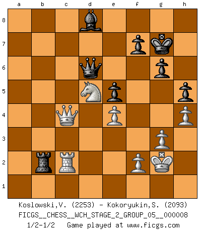 Last move : 1/2-1/2 2011 June 22 9:24:37 [Event "FICGS__CHESS__WCH_STAGE_2_GROUP_05__000008"] [Site "FICGS"] [Date "2011.04.03"] [Round "1"] [White "Koslowski,Volker"] [Black "Kokoryukin,Sergey"] [Result "1/2-1/2"] [WhiteElo "2253"] [BlackElo "2093"] 1.e4 c5 2.Nf3 Nc6 3.d4 cxd4 4.Nxd4 e5 5.Nb5 d6 6.N1c3 a6 7.Na3 b5 8.Nd5 Nf6 9.Bg5 Be7 10.Bxf6 Bxf6 11.c3 Rb8 12.Nc2 Bg5 13.a4 bxa4 14.Ncb4 Bd7 15.Bxa6 Nxb4 16.Nxb4 Qa5 17.Qxd6 Rb6 18.Qd3 Be7 19.Nd5 Rxb2 20.O-O Qc5 21.c4 O-O 22.Bb5 Bxb5 23.cxb5 Rb8 24.Rxa4 Bd8 25.R4a1 Qxb5 26.Qc3 Qe8 27.Ra8 Qb5 28.R8a1 Qe8 29.Ra8 Qb5 30.Rxb8 Qxb8 31.Rc1 g6 32.g3 Kg7 33.Kg2 Rb3 34.Qc6 Rb1 35.h4 h5 36.Qc3 Rb3 37.Qd2 Rb1 38.Qd1 Rb2 39.Qf3 Qd6 40.Qc3 Re2 41.Qc4 Rb2 42.Rc2 1/2-1/2 Sicilian : Labourdonnais-Loewenthal (Kalashnikov) variation Kingside Castling by player White (move 20) Kingside Castling by player Black (move 21) This chess game ended in a draw. Follow this game move after move (download)The isolated Pawn casts gloom over the entire chessboard. (Aaron Nimzovich) Ich hatte Angst gegen einen russischen Großmeister zu verlieren, und er befürchtete gegen einen kleinen Jungen zu verlieren. (über ein Remis gegen Juri Awerbach). (Robert James Fischer) Solo existe una cosa que Fischer hace en el Ajedrez sin placer: ¡perder!. (Boris Spassky) C'est une question de caractère, Beaucoup de gens perdent leur motivation très vite. D'autres, ils sont rares, peuvent la conserver très longtemps. J'aime les échecs, encore aujourd'hui je suis heureux d'analyser des parties. J'aime toujours gagner, je déteste encore perdre. Bien jouer est important pour mon intégrité intellectuelle et morale. Et puis les échecs vivent en ce moment une période historique grâce à Internet. Ils se développent dans les systèmes éducatifs à travers le monde. Ils sortent de leur ghetto, et c'est mon rôle de mener à bien cette révolution. (Gary Kasparov) Lottery : A tax on people who are bad at math. (Author unknown)