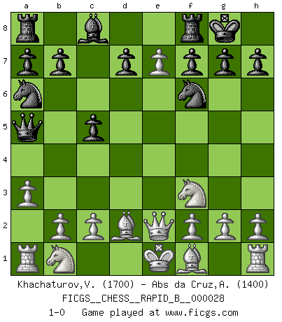 Last move : 1-0 2007 January 5 17:34:15 [Event "FICGS__CHESS__RAPID_B__000028"] [Site "FICGS"] [Date "2006.12.17"] [Round "1"] [White "Khachaturov,Vadim"] [Black "Abs da Cruz,Andre"] [Result "1-0"] [WhiteElo "1700"] [BlackElo "1400"] 1.e4 c5 2.Nf3 Nc6 3.d4 e6 4.d5 exd5 5.exd5 Nb4 6.a3 Na6 7.d6 Nf6 8.Qe2+ Be7 9.Bg5 O-O 10.dxe7 Qa5+ 11.Bd2 1-0 Sicilian defense Kingside Castling by player Black (move 9) Player White won this chess game. Follow this game move after move (download)Methodical thinking is of more use in Chess than inspiration. (C. J. S. Purdy) Schon mancher Spieler hat aufgegeben, um zu vermeiden, daß er eine Figur verliert. (Savielly Grigorievitsch Tartakower) Sin errores no puede haber brillantez. (Emanuel Lasker) 'L'échange des dames est un coup dur pour les deux adversaires...' Un journaliste lors d'une partie du match Spassky-Fischer Indecision is the key to flexibility. (Unknown)