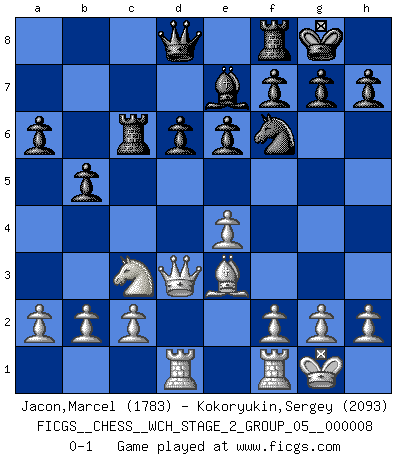 Last move : 0-1 2011 June 1 19:8:17 [Event "FICGS__CHESS__WCH_STAGE_2_GROUP_05__000008"] [Site "FICGS"] [Date "2011.04.03"] [Round "1"] [White "Jacon,Marcel"] [Black "Kokoryukin,Sergey"] [Result "0-1"] [WhiteElo "1783"] [BlackElo "2093"] 1.e4 c5 2.Nc3 d6 3.Bb5+ Nc6 4.d3 Nf6 5.Nf3 Bd7 6.Bg5 e6 7.d4 cxd4 8.Nxd4 Be7 9.O-O O-O 10.Nxc6 Bxc6 11.Qd3 Rc8 12.Bxc6 Rxc6 13.Rad1 a6 14.Be3 b5 0-1 This chess game has been lost on time (started : 2011.04.03 21:9:44) Sicilian : Closed Kingside Castling by player White (move 9) Kingside Castling by player Black (move 9) Player Black won this chess game. Follow this game move after move (download)Modern Chess is too much concerned with things like Pawn structure. Forget it, Checkmate ends the game. (Nigel Short) Schachspieler können ausgezeichnet Varianten am Schachbrett berechnen, aber nicht im realen Leben. Zu stark ist der Individualismus im Schach ausgeprägt, und für viele ist ein kleiner momentaner persönlicher Vorteil wichtiger als ein weit größerer Vorteil von morgen. (Anatoly Karpov) Yo nunca en mi vida he jugado la Defensa Francesa, que viene siendo la más aburrida de todas las Aperturas. (Wilhelm Steinitz) Les Echecs représentent une sphère d'idées créatrices basée sur la volonté des deux protagonistes. (Smyslov) Luck is the residue of design. (John Milton)